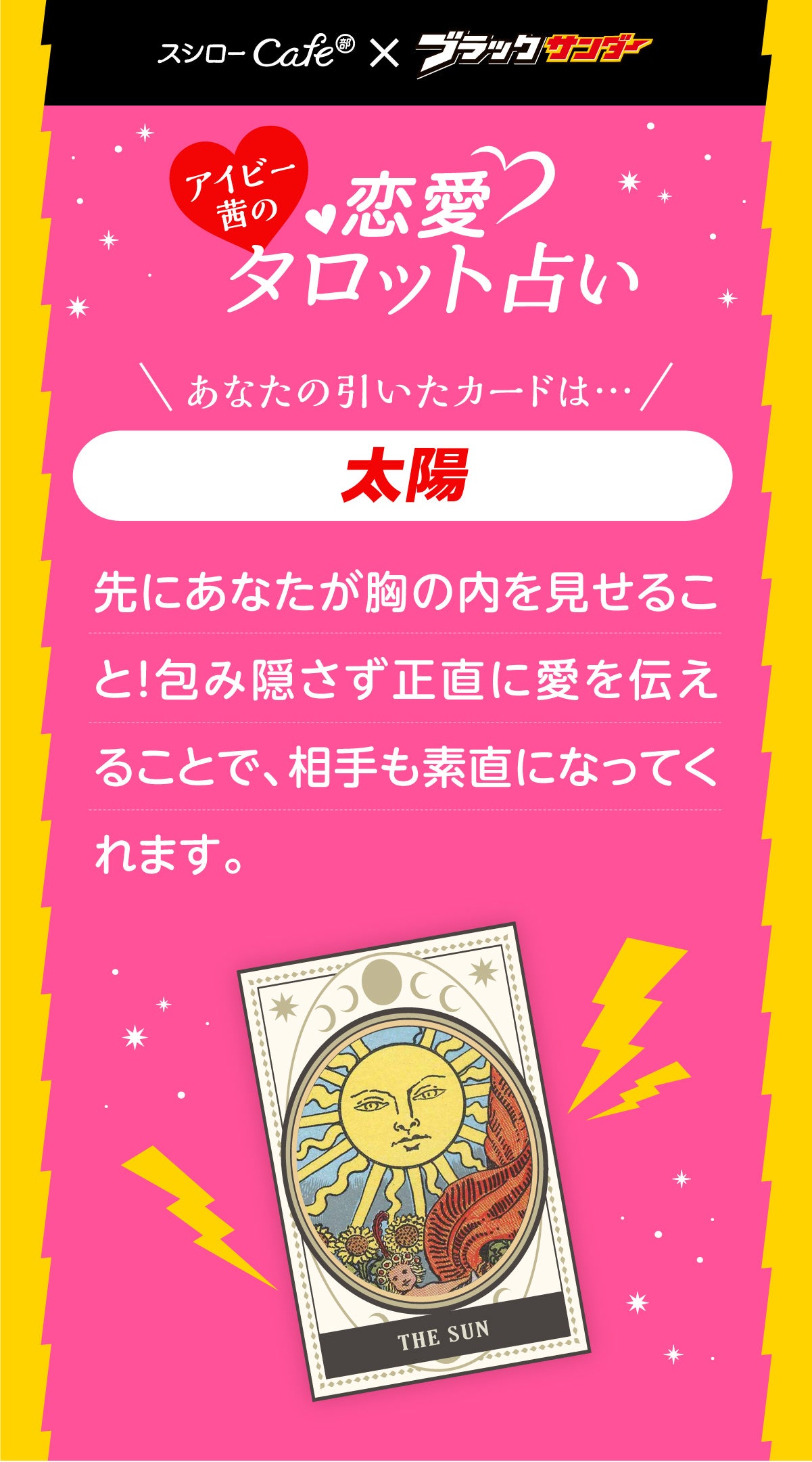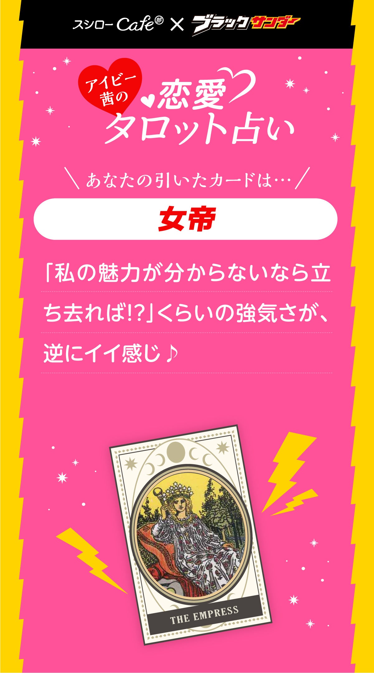 「本命のザクふわブラックサンダーパフェ」では、恋愛タロット占いを楽しむことができます。商品についてくるピックの裏にある二次元コードを読み取ると、占いを引くことができます。占いの監修は、若手ながら的中率の高い本物の鑑定をすると話題のアイビー茜先生です。タロット恋愛占いくじを引かれた方から抽選で100名さまにブラックサンダー1箱(20本入)が当たるキャンペーンも実施しています。