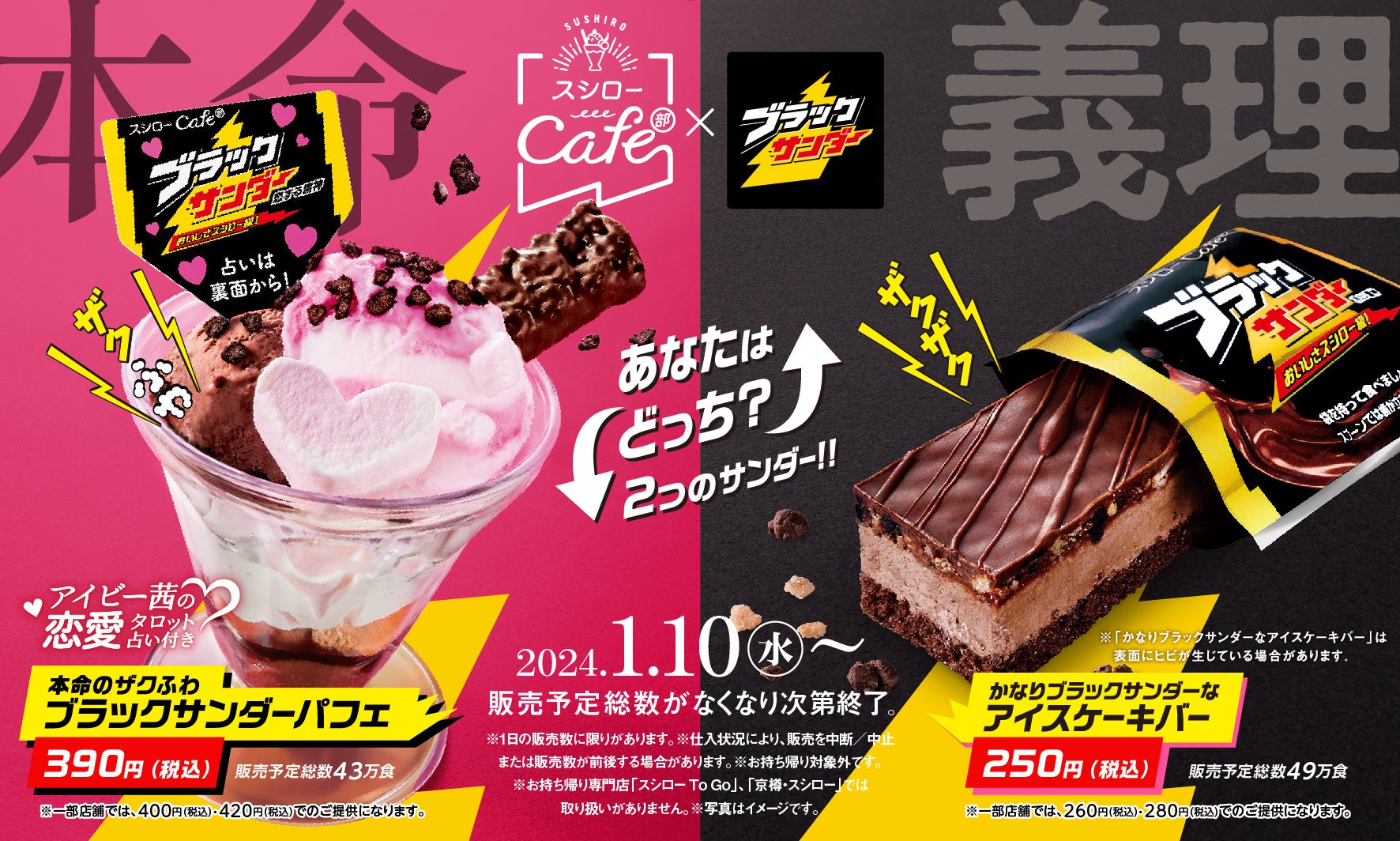 “スシローカフェ部”は、「そそる、べつ腹。おどれ、ココロ。」をテーマに、おすしを食べた後でも美味しく食べられるスイーツを開発・販売しています。今回、1994年の発売以来、長きにわたって愛されているロングセラー商品「ブラックサンダー」とコラボレーションし、バレンタインに向けて“本命”と“義理”の2つのスイーツを販売いたします。