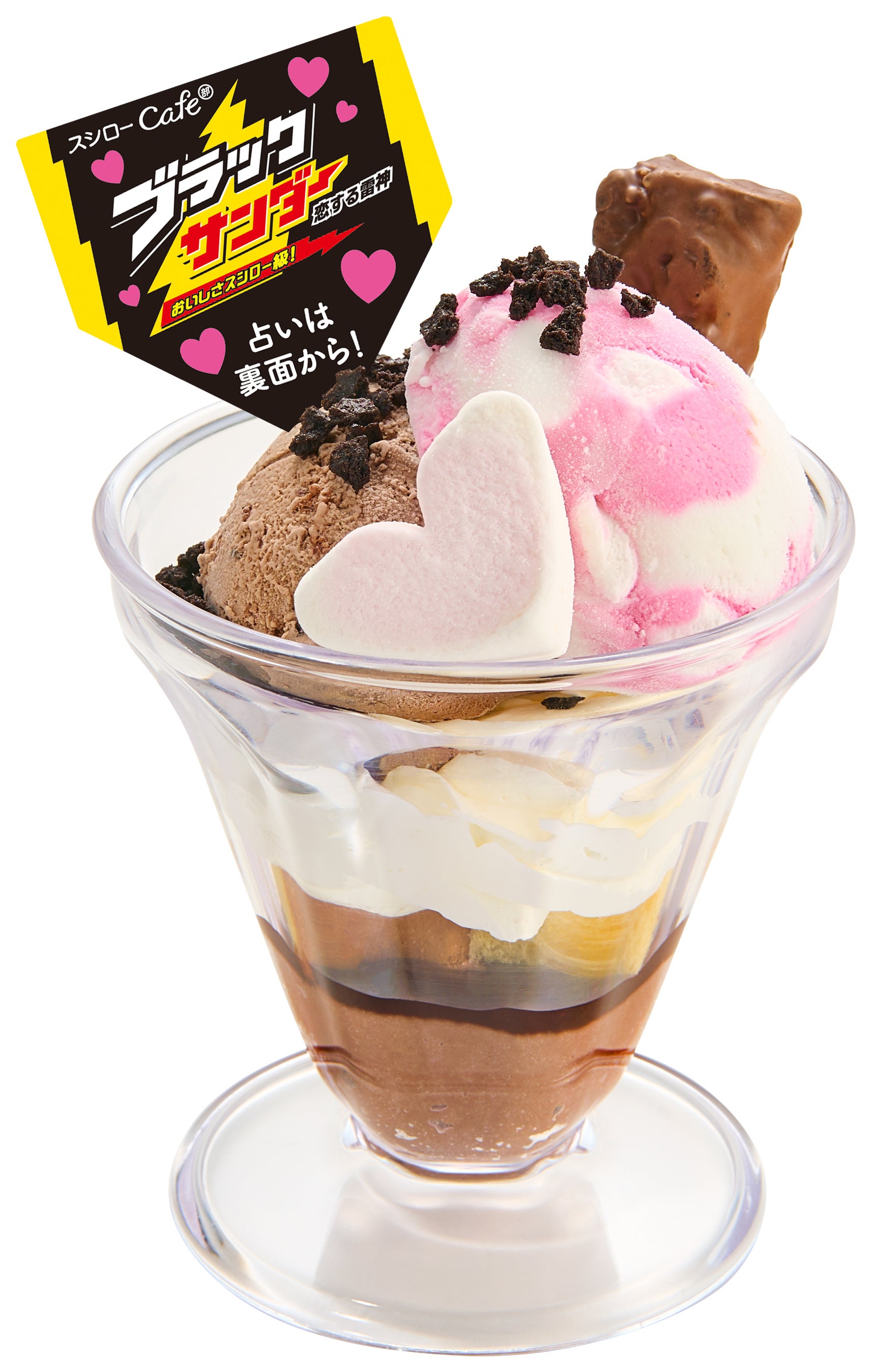 “義理”のイメージが強い「ブラックサンダー」ですが、バレンタインに本命の方とも一緒に気軽に食べてもらいたいという想いから今回のコラボレーションが実現しました。「本命のザクふわブラックサンダーパフェ」は、ブラックサンダーをイメージしたチョコアイスとココアクランチ、さらにはブラックサンダーのミニバーをトッピングし、「ブラックサンダー」ならではのザクザク食感を表現しました。また、苺とミルク風のマーブルアイスにはマシュマロが入っており、その上可愛らしいハートのマシュマロも添えることで、ザクザクとふわふわ、2つの食感をお楽しみいただけます。「本命のザクふわブラックサンダーパフェ」にはピックがつき、ピックにある二次元コードより有名占い師による恋愛タロット占いを引くことができます。そして、占いくじを引かれた方の中から抽選で100名さまにブラックサンダー1箱(20本入)が当たるキャンペーンも実施しますので、この機会に気になる恋の行方も占ってみてください。「ブラックサンダー」をイメージした“義理”チョコスイーツとして登場するのは、「かなりブラックサンダーなアイスケーキバー」です。ココアクッキーとプレーンビスケットにこだわり、ブラックサンダーの特長であるザクザク食感を表現したアイスケーキです。パッケージも「ブラックサンダー」をイメージし、遊び心たっぷりに仕上げました。