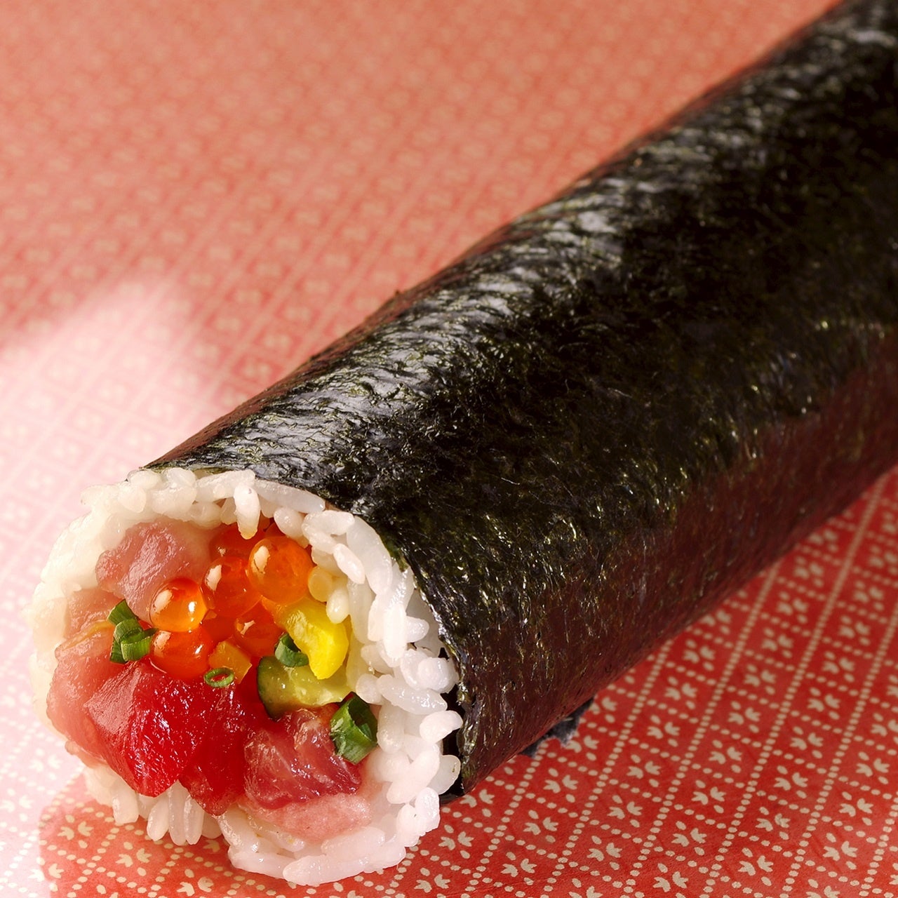 「柿家すし」では、恵方巻き以外にも2種類の丸かぶり寿司をご用意しています。長さ約17cmでボリュームたっぷり、まぐろを堪能できる海鮮と、お子様にも嬉しいお肉巻き、ご家族やご友人とそれぞれお好みでお選びいただけます。