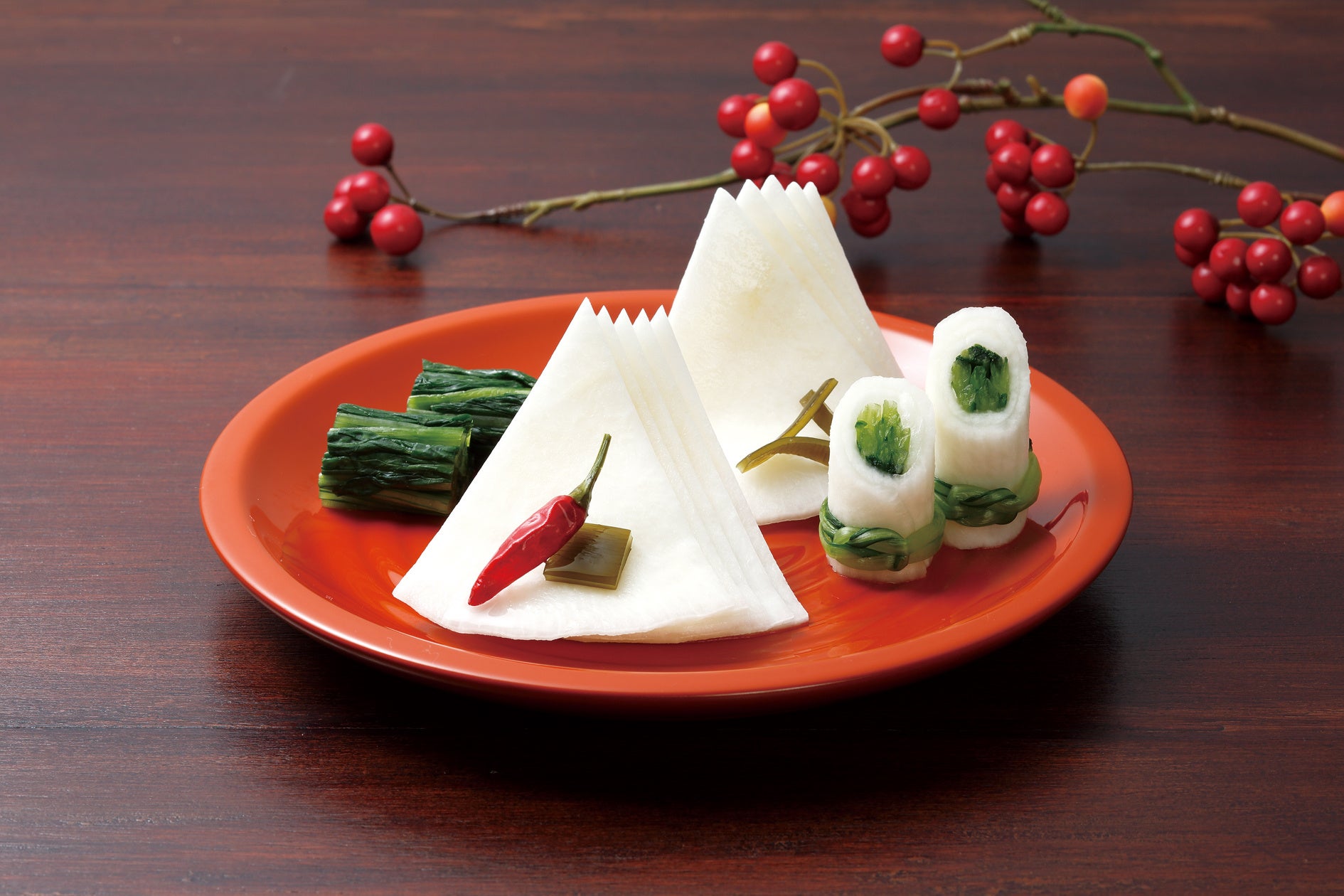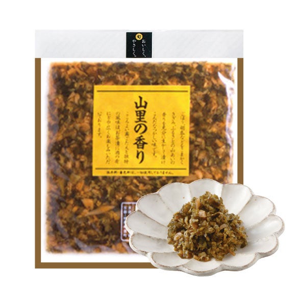 上品で繊細な旨みが特徴の「聖護院かぶら」の持ち味を生かした、一枚ずつ丁寧に漬け込んだ伝統の“西利の千枚漬”と、山ごぼうや胡瓜など、ふるさとの山あいの香りをたっぷりと詰め込んだ漬物“山里の香り”の盛り合わせです。