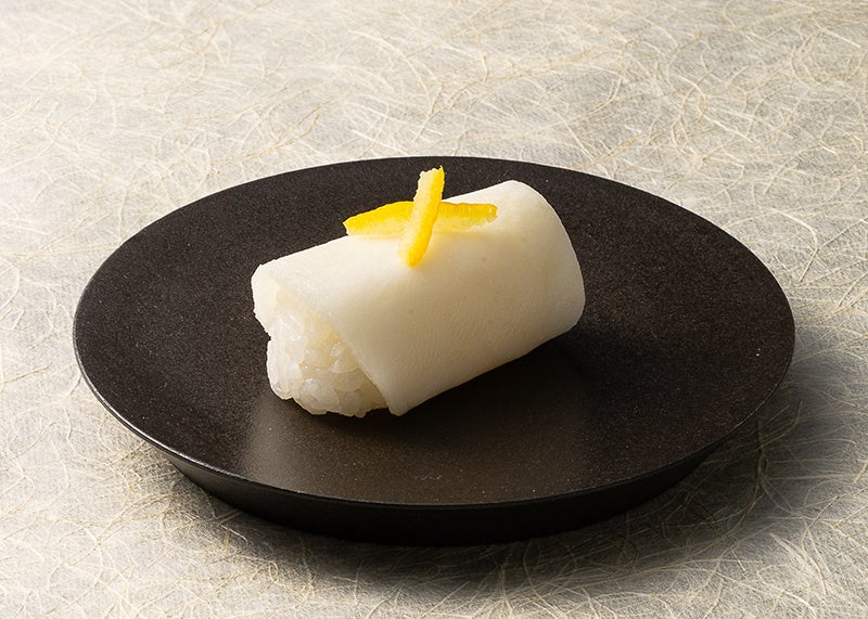 かっぱ寿司こだわりの舎利を、きめ細かな食感とみずみずしい風味の千枚漬(1/2枚)でくるみ、柚子をあしらいました。