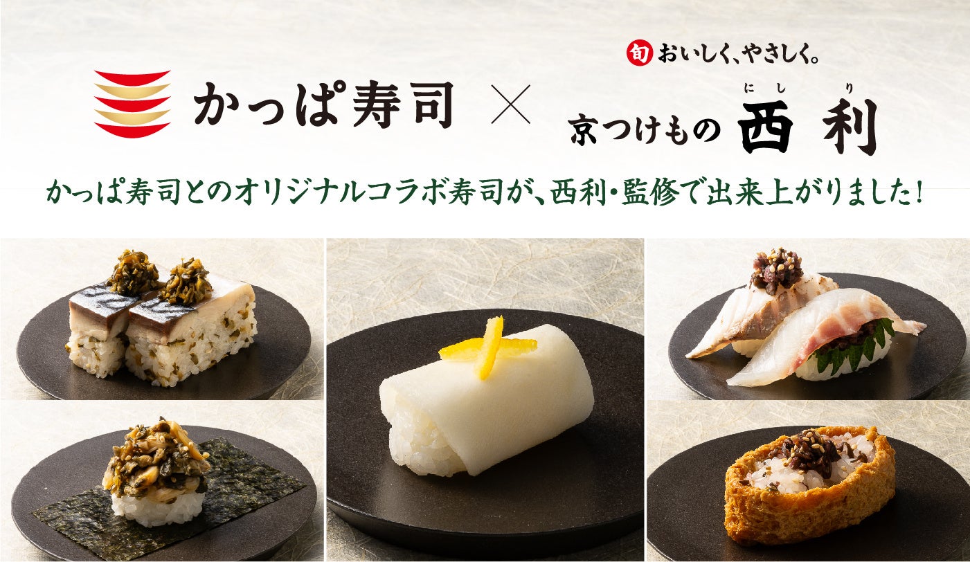 京つけもの西利((株)西利 本社:京都市下京区)は、コロワイドグループのかっぱ寿司(カッパ・クリエイト(株)(本社:神奈川県横浜市)とコラボレーションした「京つけもの西利」監修『京漬物を使った寿司』5品他を2024年1月11日(木)~2月7日(水)の期間、販売いたします。今が旬、西利の看板商品「千枚漬」をはじめ、人気の京漬物を使った特製寿司が登場!全国のかっぱ寿司でしか味わえない限定のおいしさをお楽しみいただけます。