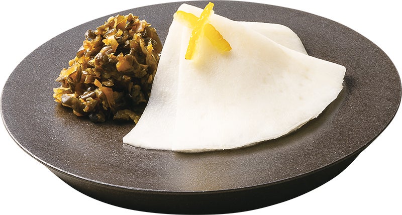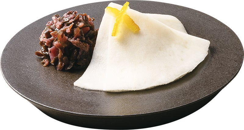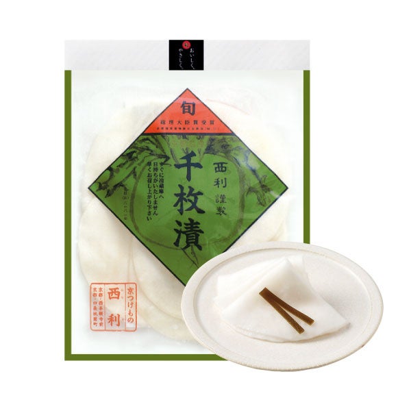 伝統の京野菜「聖護院かぶら」を薄く切り、北海道産の昆布で1枚1枚丁寧に漬け込んだ“西利の千枚漬”を使用した一品です。