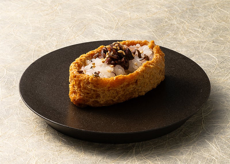 “ゆかりむらさき”といりごまを混ぜ込んだ舎利を、油揚げを裏返しにして包む「裏巻き」で仕上げました。「裏巻き」のふっくらした食感や油揚げの甘じょっぱさ、“ゆかりむらさき”の風味など、絶妙な味わいをお楽しみください。