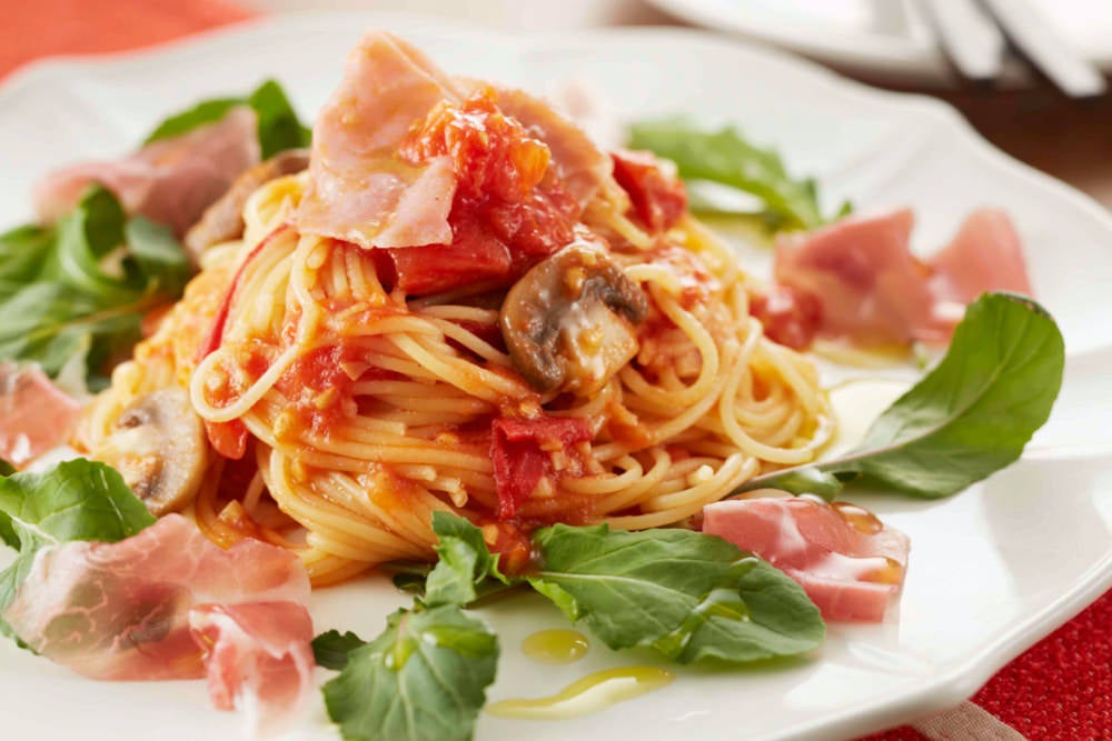 ■おすすめレシピ「生ハムとマッシュルームのトマトソースフェデリーニ」