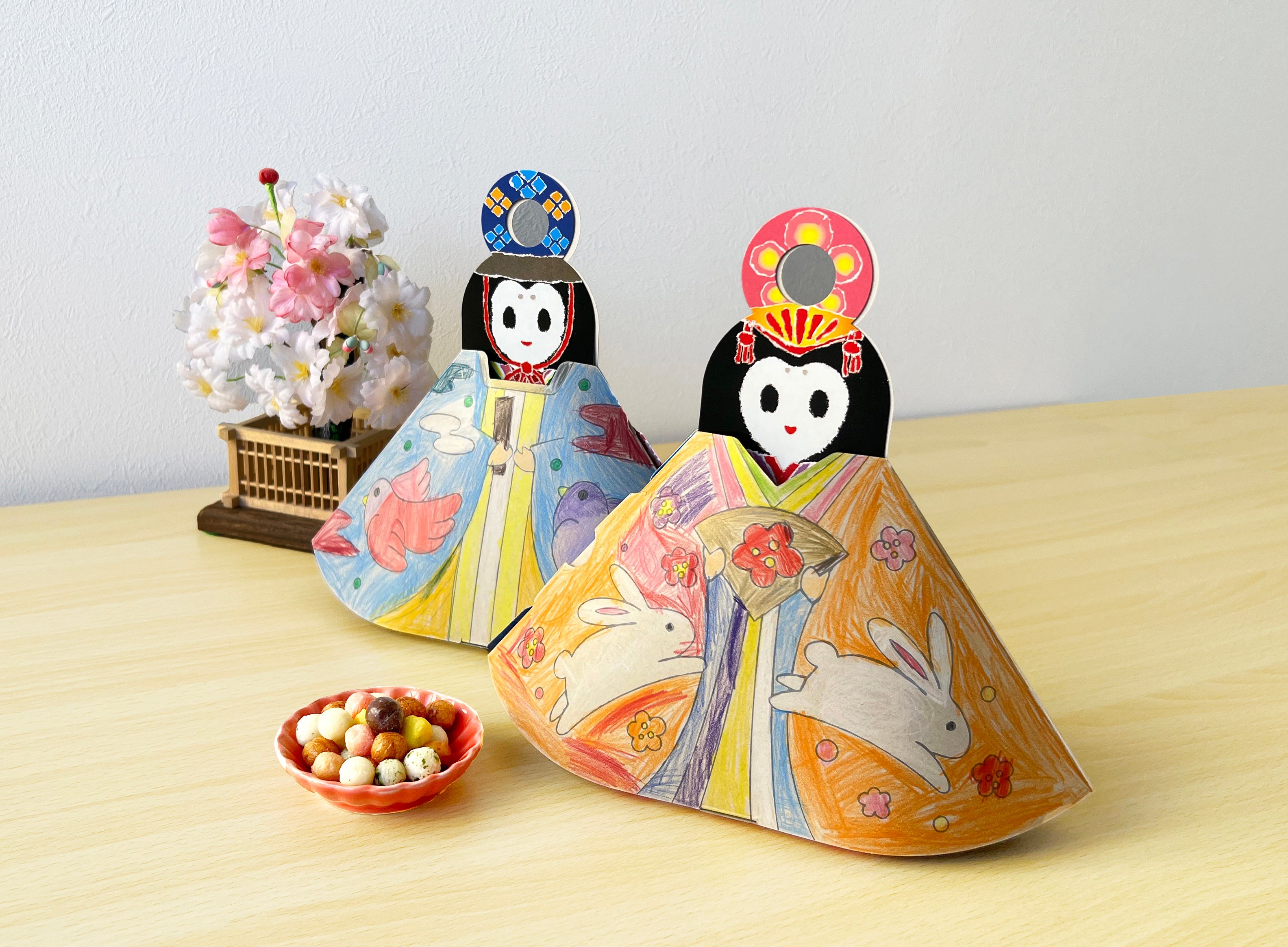 ひな人形のちぎり絵調のデザインは、花や鳥や蝶などテーマにあわせて、一枚一枚パーツを細かく張り合わせて作られたものをプリント。手作りのデザインならではの素朴さとあたたかさがひなまつりに彩りを添えます。2009年からは子供たちが食べた後も楽しめるように、パッケージの衣部分の裏に塗り絵を追加。子供たち自身が好きな色を塗った、自分だけのひな人形を飾ることができるようになりました。