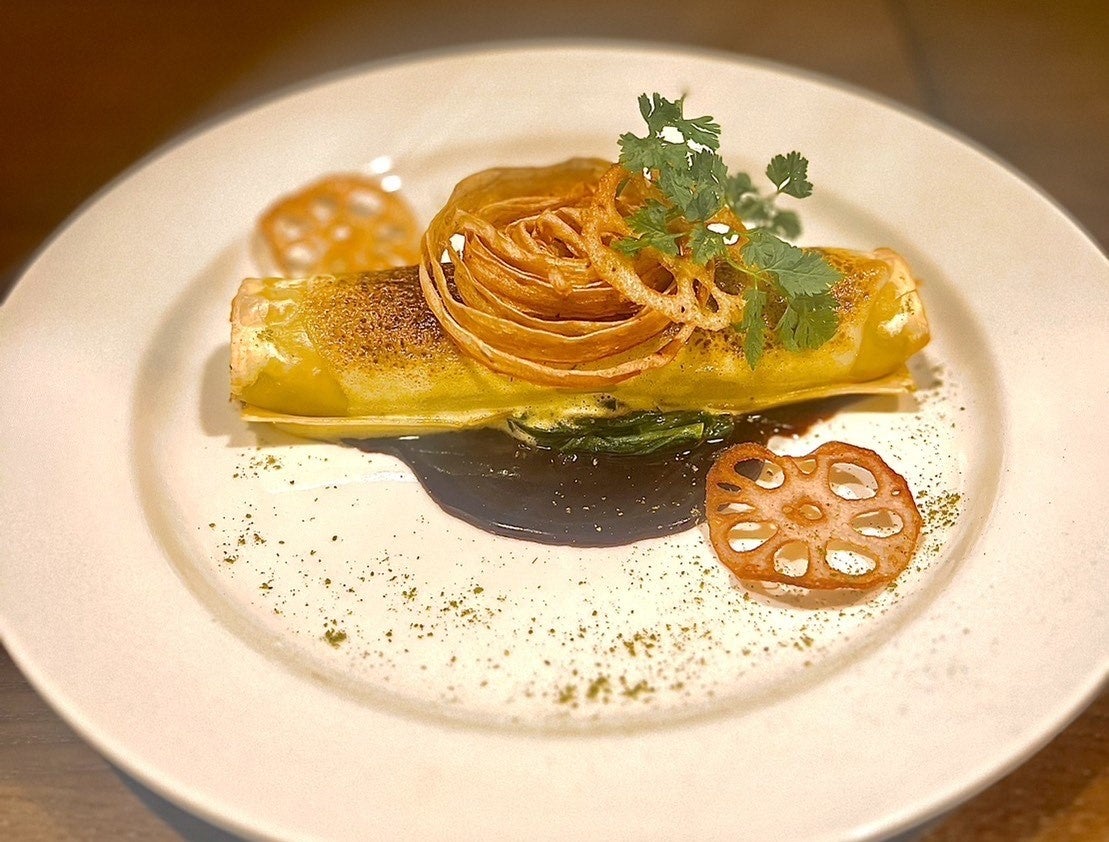 千葉県の根菜とイノシシのカネロニ仕立て 味噌風味の赤ワインソース
