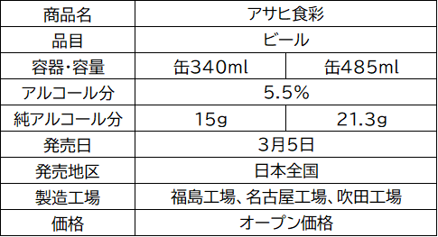 アサヒビール株式会社(本社 東京、社長 松山一雄)は、全国の酒類取り扱いのコンビニエンスストア※限定で展開しているプレミアムビール『アサヒ食彩』を、3月5日から全業態で販売を開始します。