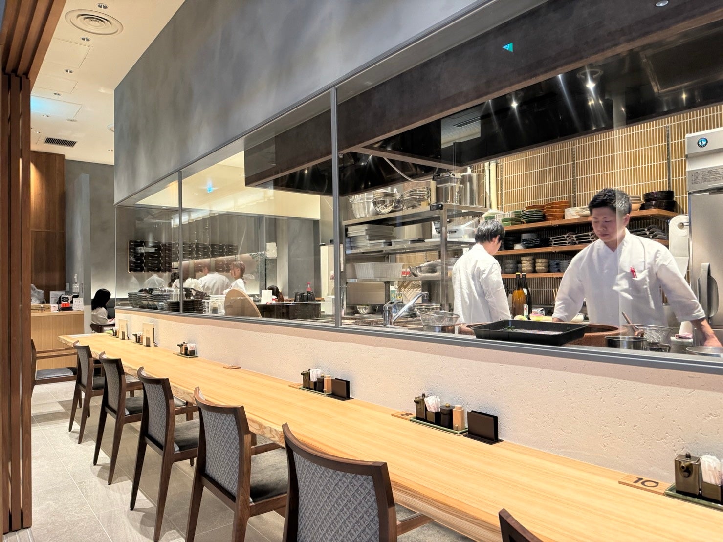 店舗正面・カウンターからは、うなぎ・天ぷらの調理風景がダイレクトにご覧いただき、たのしんでいただけるようカウンターキッチンを採用。