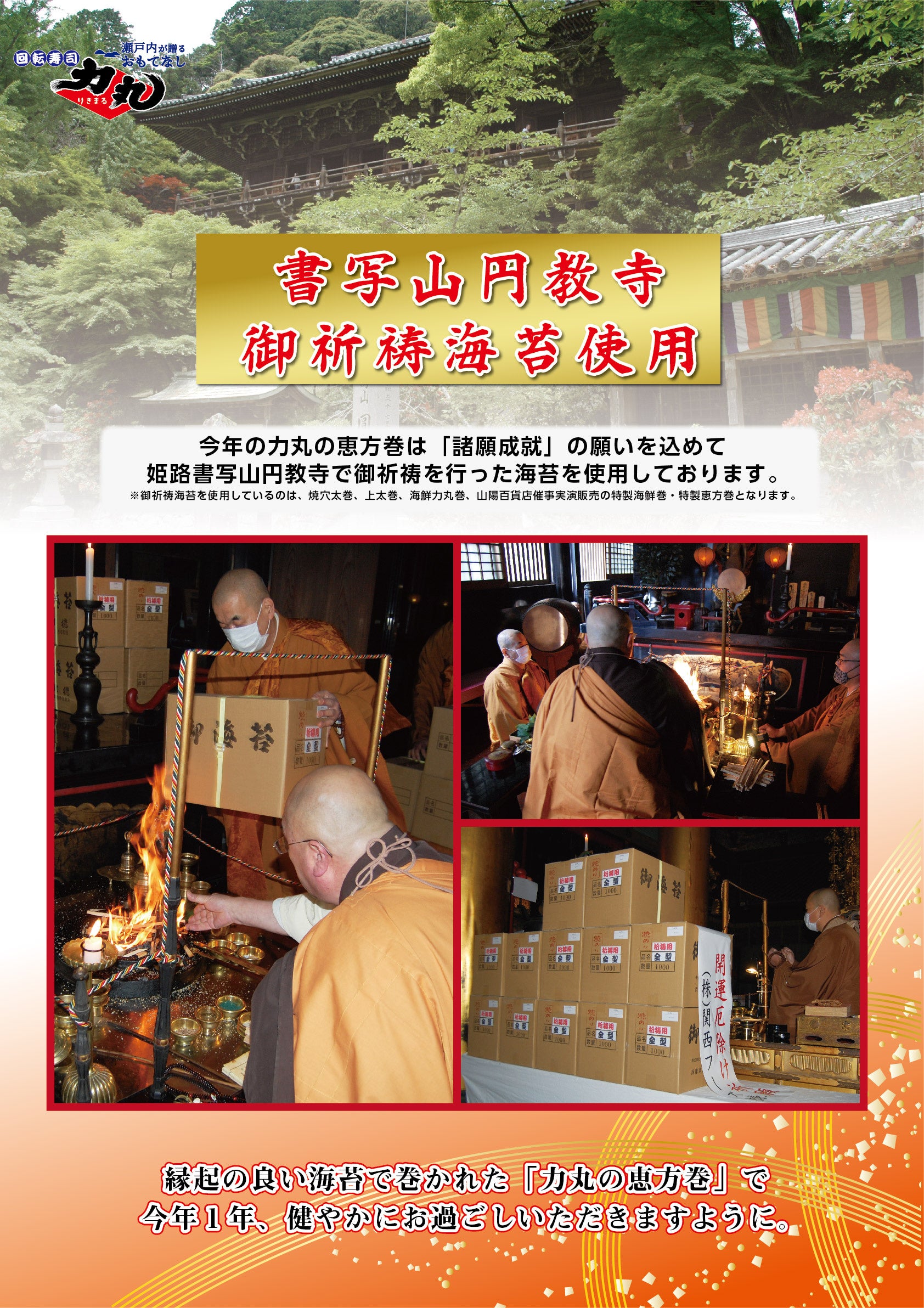 本年度販売する全ての恵方巻の海苔は書写山圓寺で「諸願成就」の御祈祷を行っていただきました。書写山圓寺は1300年の歴史を持つ西国三十三所の一つであり、映画でも有名になった地元姫路のお寺です。地元の皆様に支えられてきた外食企業として、節分という一つの区切りに何かできないかと考えた結果、「縁起の良いの海苔で巻かれた力丸の恵方巻を召し上がっていただこうと本商品を企画いたしました。