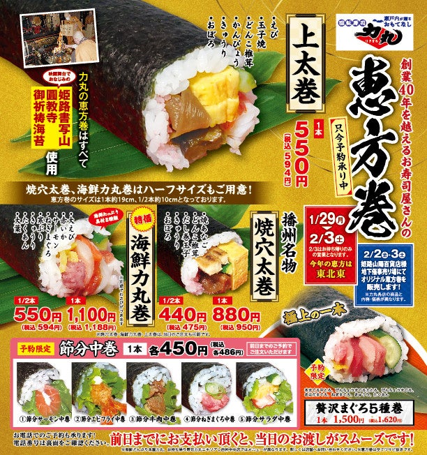 兵庫県姫路市を中心に回転寿司力丸を15店舗展開する株式会社関西フーズ(代表取締役:福永力夫)は、回転寿司力丸で諸願成就の願いを込めた、特製恵方巻を1月29日〜2月3日(山陽百貨店での販売は2月2日〜2月3日)の期間限定で販売いたします。販売する全ての恵方巻が映画等でも有名になった書写山圓寺で御祈祷を行った海苔を使用しており、様々な災害も多い世の中で地域の皆様、そして日本中が元気で健やかな一年をお過ごしいただきたいという願いを込めました。