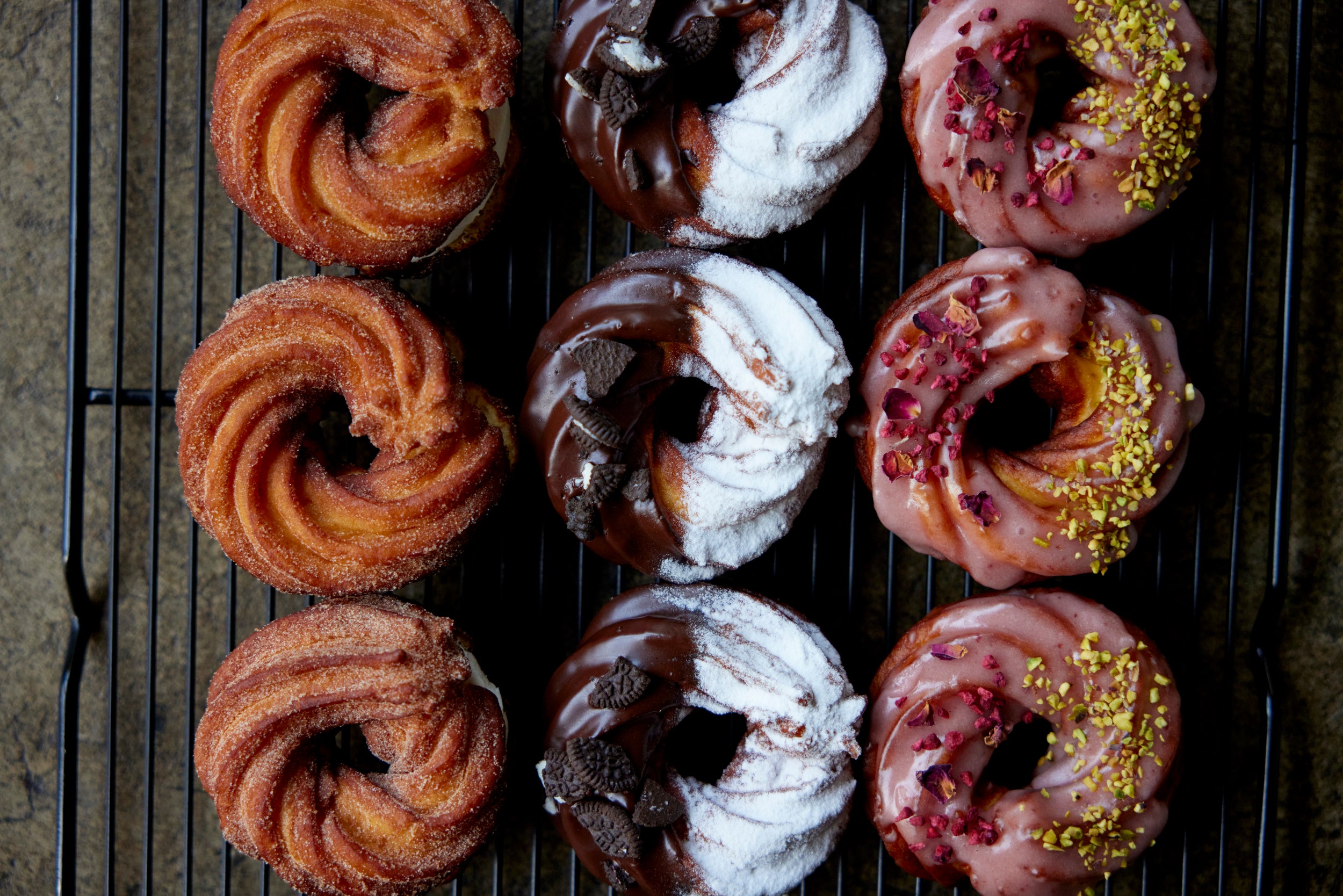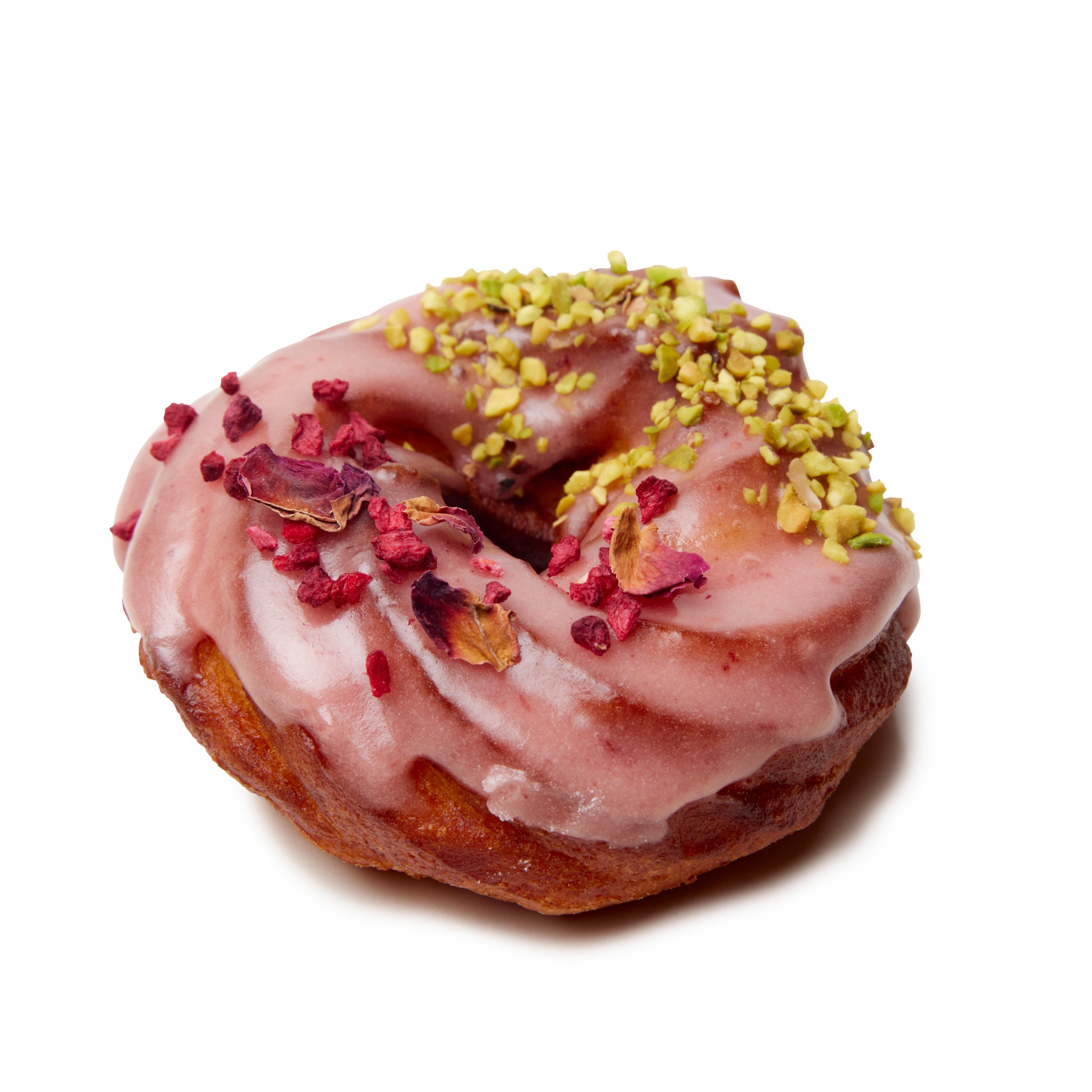 ピスタチオと相性のよいベリーのソースは見た目にも華やか。甘酸っぱさのバランスがほどよいクルーラーです。