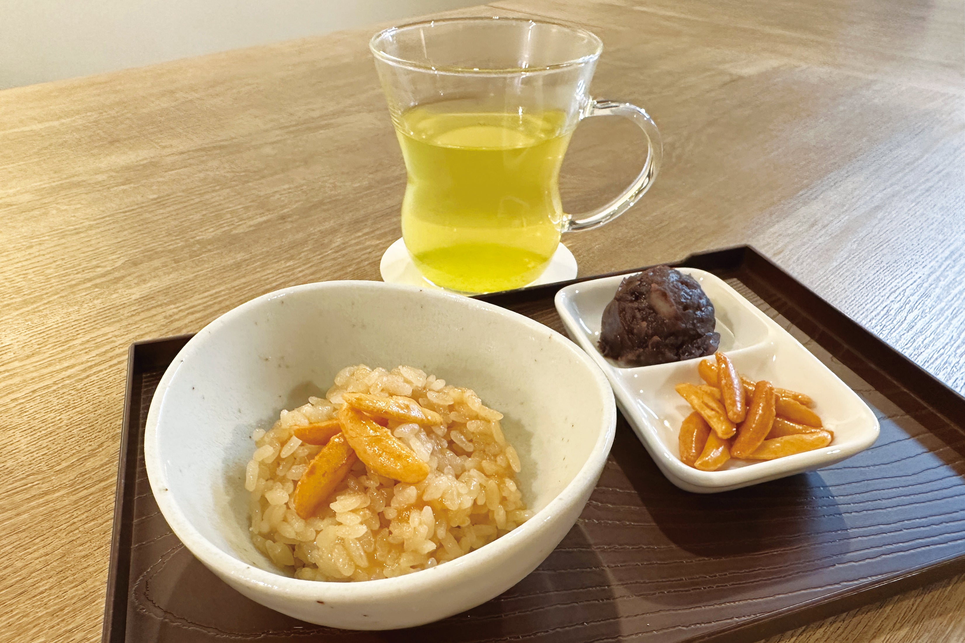炊きあがりのモチモチ感を出すために、何度も柿の種の量や、ほんのり味付けの醤油の分量も繊細な調整で完成したおこわは味も香りも絶品。