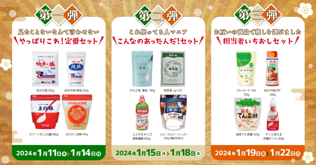 2024年1月11日(木)“塩の日”からスタートするXキャンペーンでは、3連続お年玉企画としてお砂糖とお塩のセットを、塩の日にちなみ合計111名様(各37名様×3回)にプレゼントいたします。