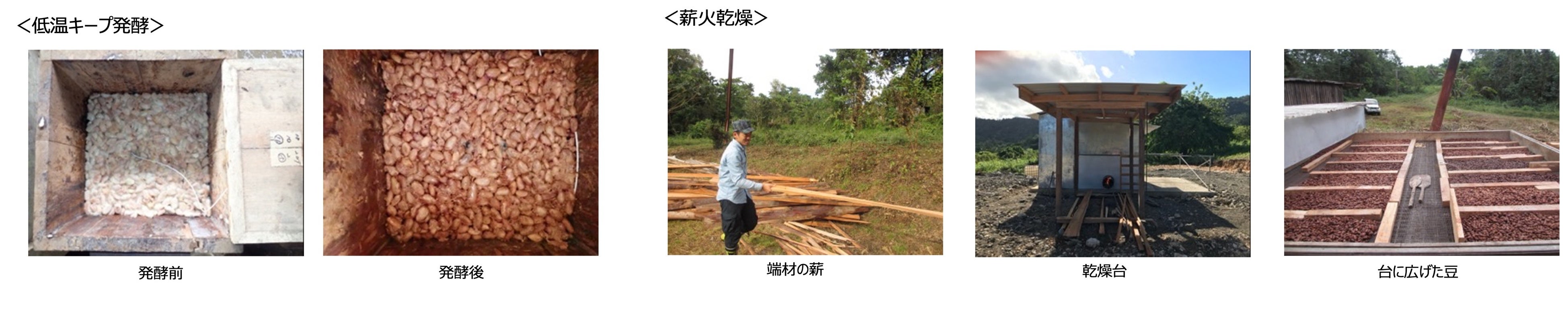 低温条件を一定期間キープし、酵母が働きやすい条件にした低温キープ発酵で、短期間で発酵させることでカカオ豆本来の香りを生かします。パプアニューギニアのカカオ豆は未発酵の状態でもレーズンのような香りを持ち、この特長を生かした発酵方法です。薪火での高温短時間乾燥により発酵由来の酸味が残りやすいのも特徴です。