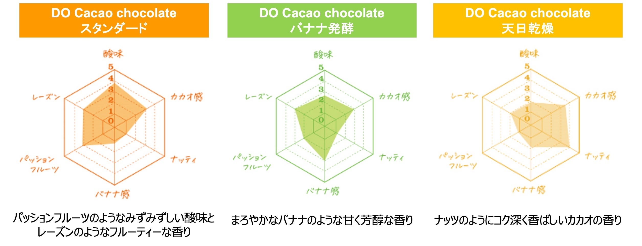 カカオ豆を発酵させる際、発酵による温度上昇を抑えた低温キープ発酵と、薪火乾燥によってフルーティーな香りを作り出した、DO Cacao chocolateのスタンダードな味わいです。
