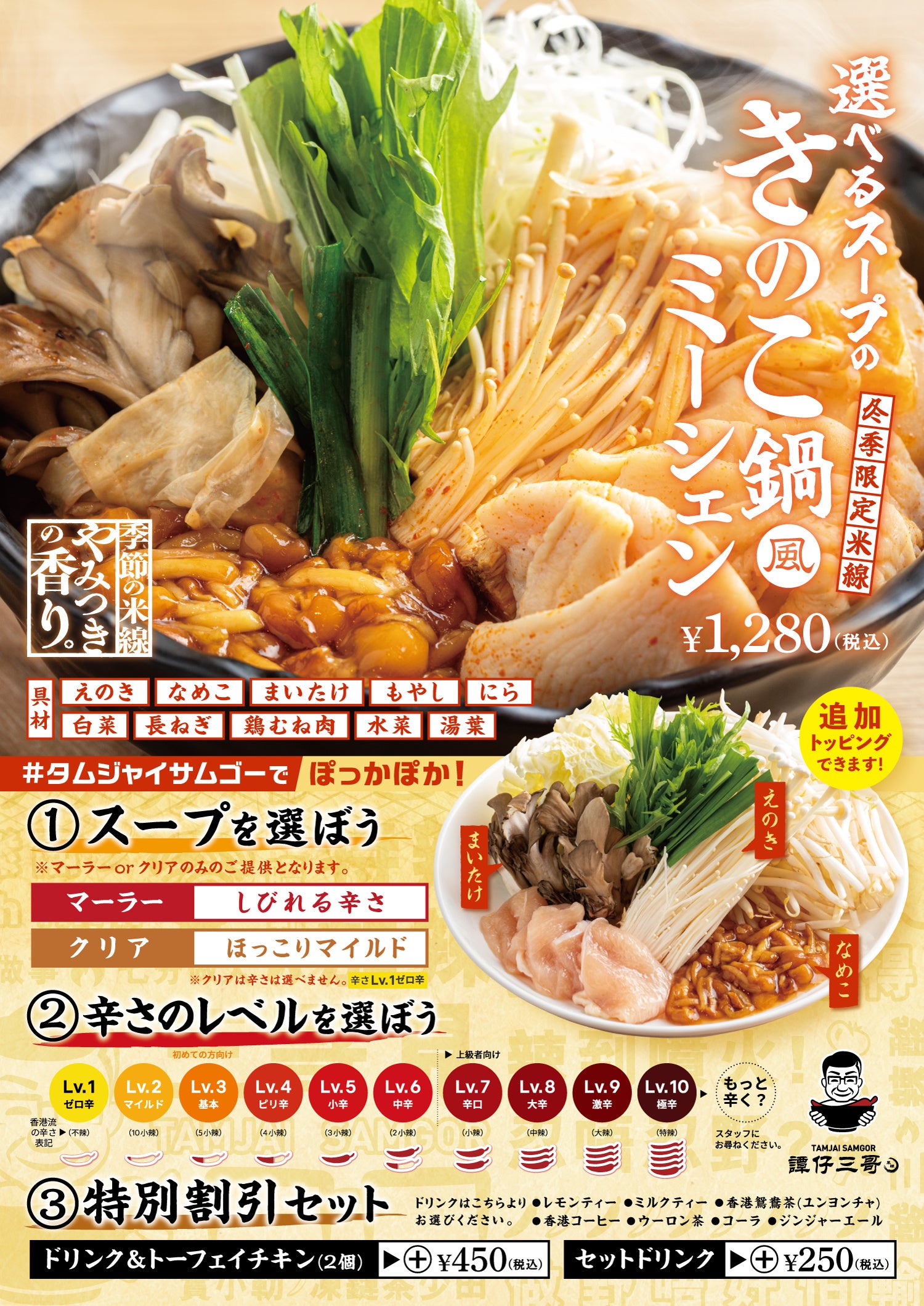 この度、寒い季節にもってこいの“鍋”をイメージし、たっぷりの具材を盛り込んだ冬季限定メニュー「きのこ鍋風ミーシェン」を販売することとなりました。具材はえのき・なめこ・まいたけの3種類のきのこに加え、にら・もやし・白菜・長ねぎ・鶏むね肉・水菜・湯葉スープと野菜お肉もふんだんに使用しています。具材と麺を引き立てるスープはタムジャイサムゴーの定番である「マーラー」とすべてのスープのベースの味である「クリア」の2種類から、お好みに合わせて選択が可能です。