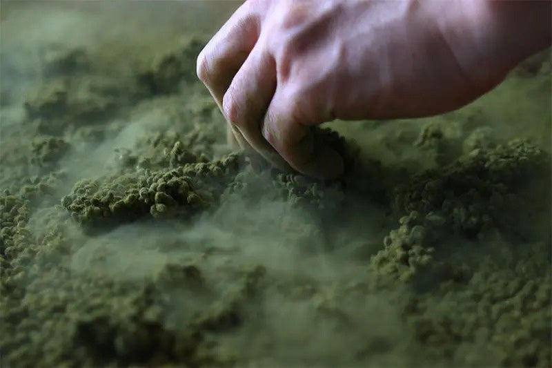 (緑色の粒はお米を原料として麹菌を生育し、麹菌の胞子が大量に育てたもの)