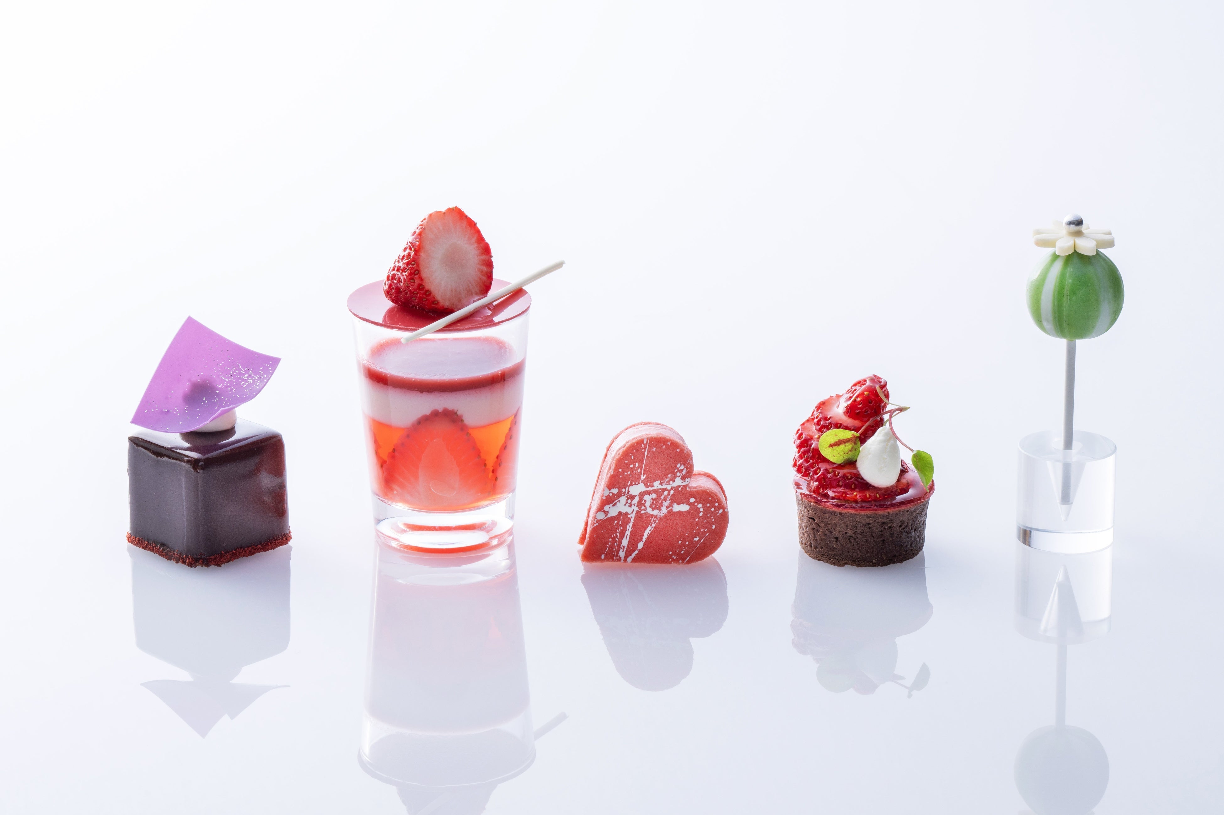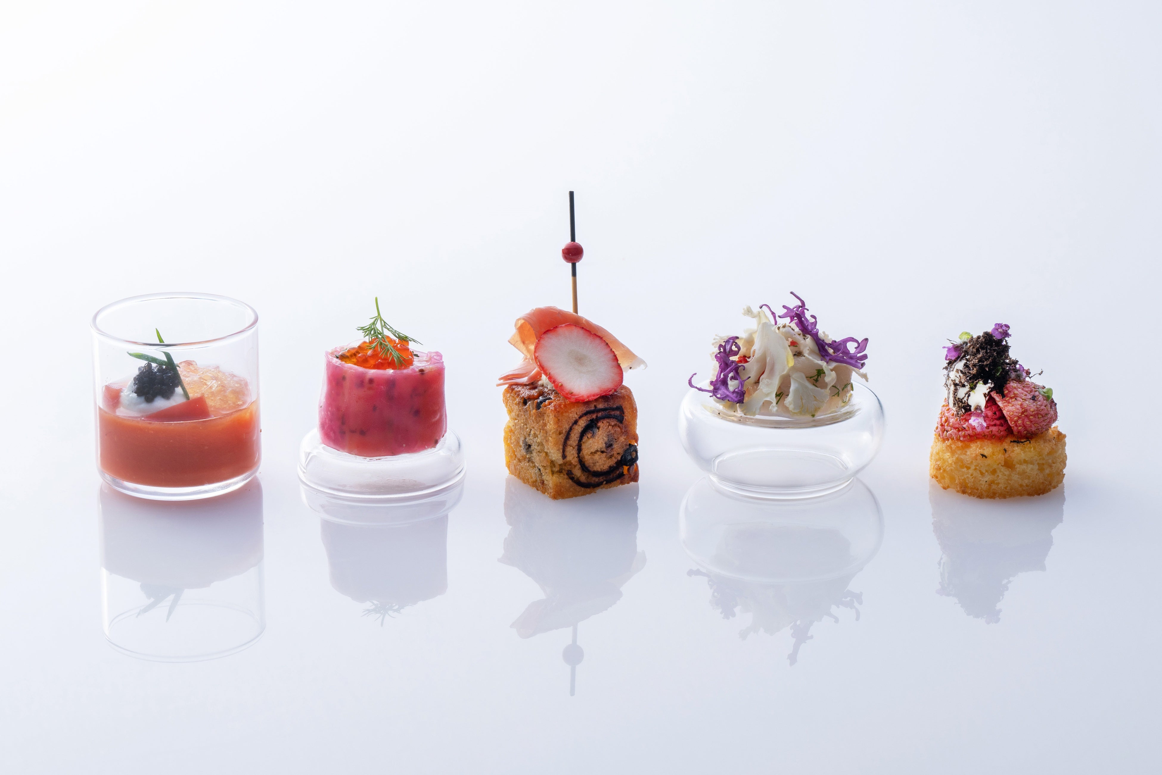 左から 「フルーツトマトカクテル」、「サーモン生春巻き」、「ストロベリー&ピスタチオケークサレ」、「カリフラワーカクテル」、「セミドライストロベリーブリオッシュ」