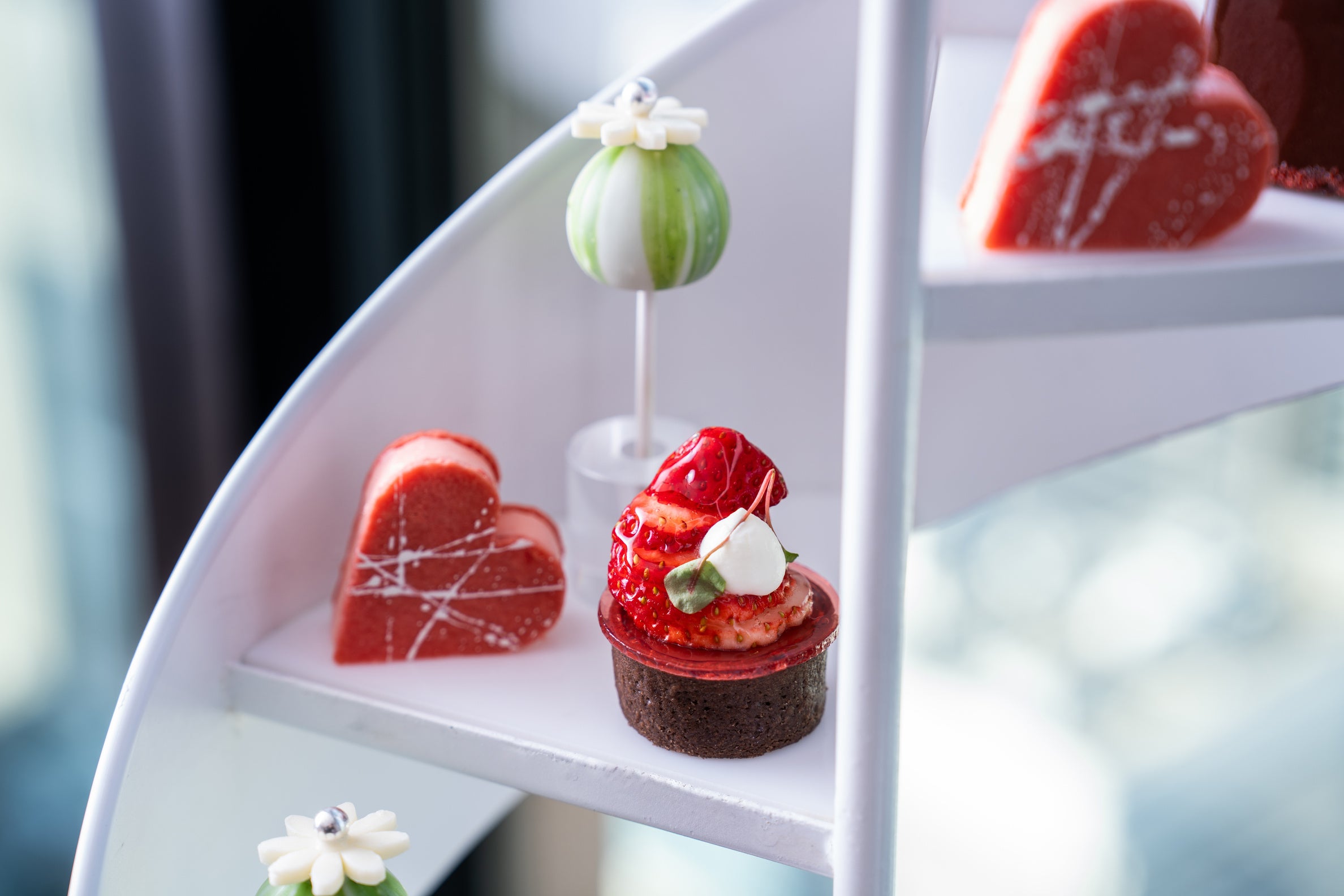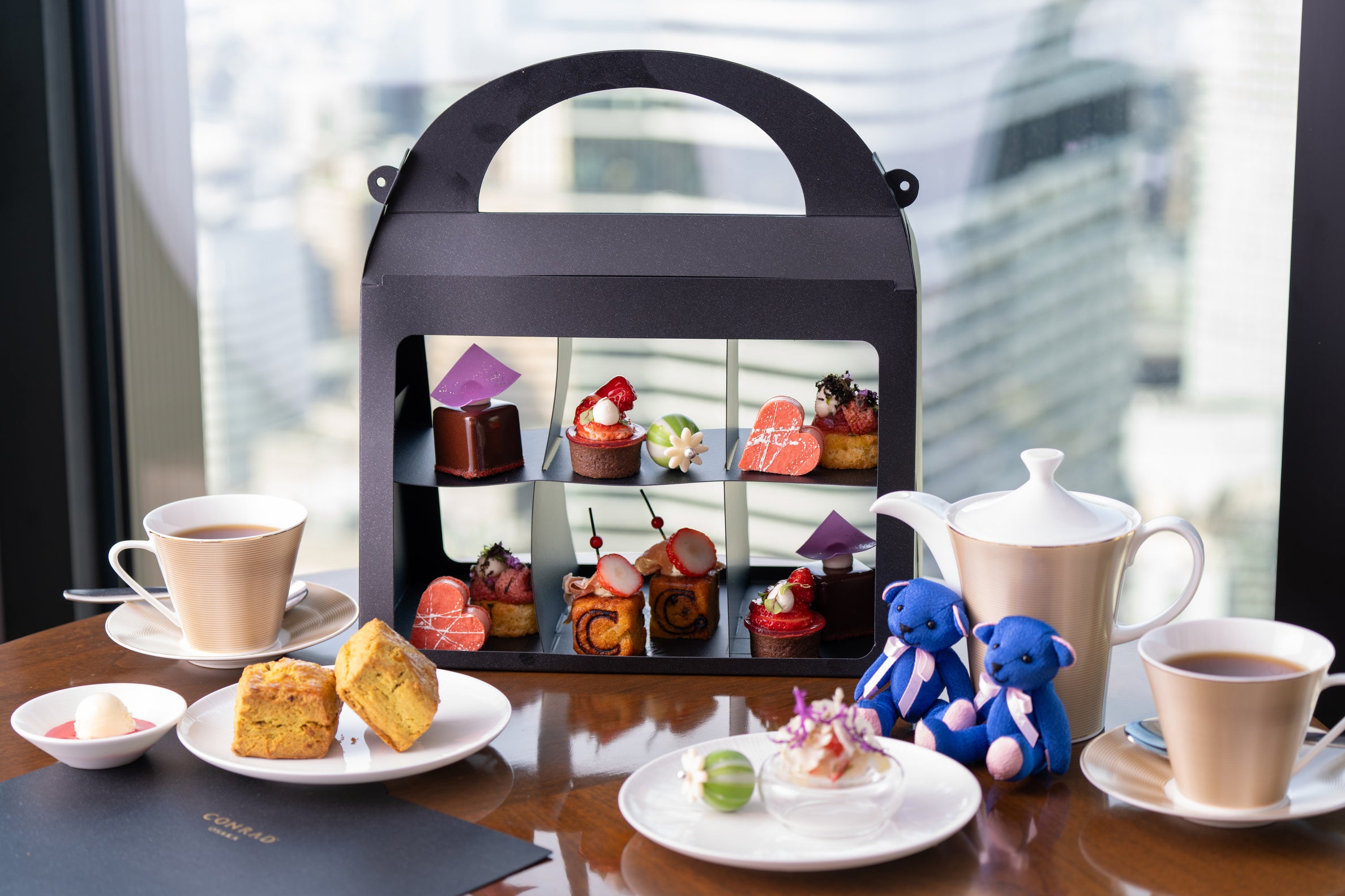 パティシエが趣向を凝らして創作するスイーツ6種は、ハート型にアート模様を施したストロベリーバタークリームサブレ「ハート」や、あまおう苺をたっぷり使用し、ストロベリーソースにコンラッドのシグネチャーフラワーである胡蝶蘭の香りを纏わせたとろけるような美味しさのパンナコッタ「メルト」、ほろ苦いカカオタルトに金柑ジャムを合わせ、ストロベリーを螺旋階段にインスパイアされたカッティングにした「スパイラル」、濃厚なストロベリーチョコレートのテリーヌを爽やかなカカオオレンジのグラサージュでコーティングした「キューブ」、可愛らしいロリポップ型のガナッシュ「フラワー」は、ストロベリーとレモンガナッシュにローストしたピスタチオを合わせて香ばしく仕上げました。人気のトラディショナルスタイルのスコーンは、抹茶と優しい甘さのホワイトチョコレートで焼き上げて、ストロベリーチョコレートソースとクロテッドクリームでお届けします。2024年のバレンタイン&ホワイトデーはラグジュアリーアフタヌーンティーと地上200メートルからの絶景で、至高の時間をお過ごしください。