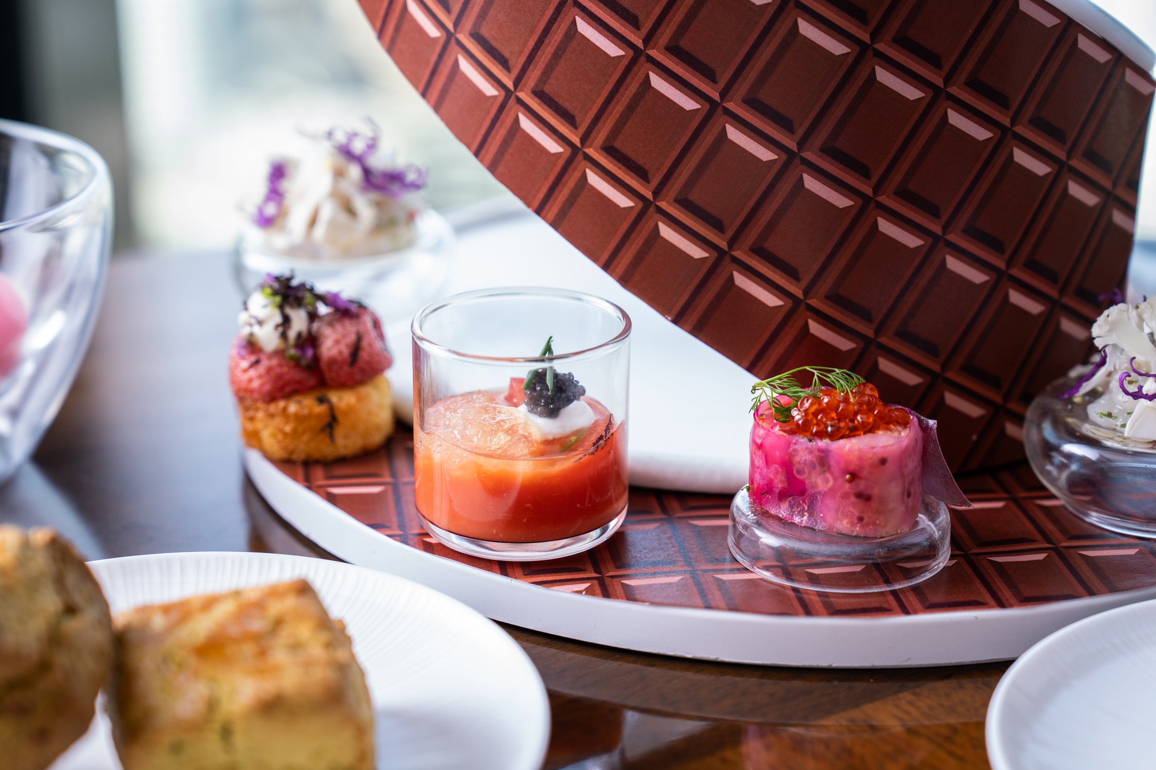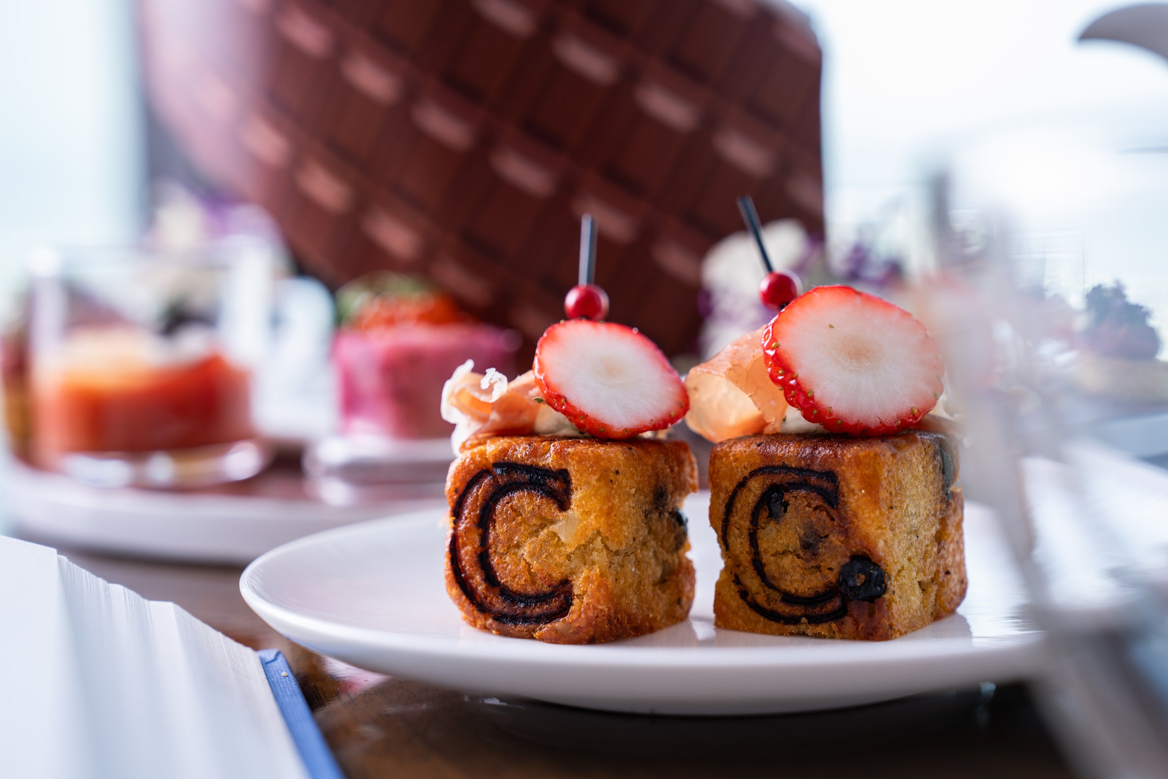 セイボリーには組み合わせを計算しつつ、ストロベリーを取り入れた3種「カリフラワーカクテル」、「セミドライストロベリーブリオッシュ」、「ストロベリー&ピスタチオケークサレ」や、スーパーフードのサーモン、ビーツ、キヌア、ケールを使用した「サーモン生春巻き」、兵庫県の弓削牧場の希少なフレッシュチーズを取り入れた「フルーツトマトカクテル」など計5種類のお料理をご用意します。コンラッドの頭文字の「C」の文字が映えるアイコニックな季節のケークサレや、まるでスイーツのように見えるようこだわったデザインなど、フォトジェニックなセイボリーアイテムも合わせてお楽しみください。