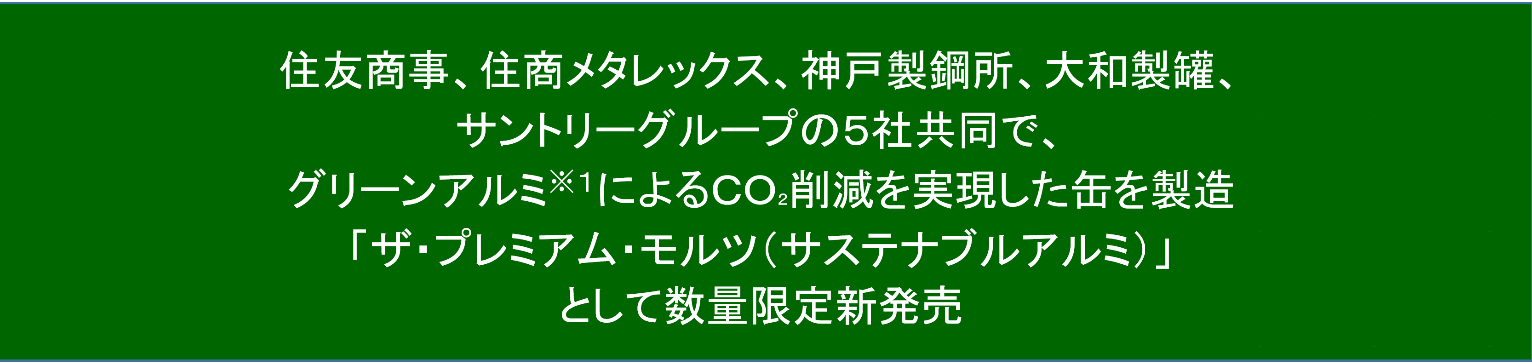 住友商事(株)、住商メタレックス(株)、(株)神戸製鋼所、大和製罐(株)、サントリーグループの5社は、業界を超えた連携により、グリーンアルミ※1をマスバランス方式※2により割り当てた缶を共同で企画・製造しました。今回製造した缶は、通常のアルミ缶※3と比較してCO2排出量を25%削減すること※4ができます。また、「ザ・プレミアム・モルツ」ブランドにて1月30日(火)から全国で数量限定新発売される「同(サステナブルアルミ)」での採用が決定しました。