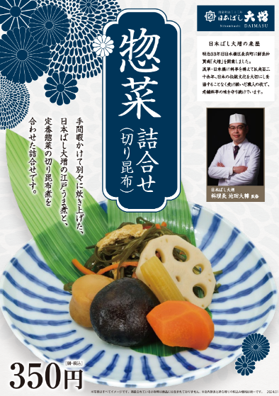 「ほんのり屋」では、具材にこだわり、日本の四季や各地域の美味しさを感じるおむすびを提供しております。今回新発売する日本ばし大増監修「惣菜詰合せ」は、ほんのり屋のおむすびと相性抜群の「野菜うま煮」と「切り昆布」を組み合わせました。「野菜うま煮」は、それぞれの食材の美味しさを引き出すように、手間暇かけて別々に炊き上げました。伝統の技が光る日本ばし大増の定番のお惣菜です。「切り昆布」は歯ごたえのよい、ごはんによく合うお惣菜です。ほんのり屋のお米にこだわったおむすびと一緒に、老舗料亭の味日本ばし大増の惣菜をお楽しみください。