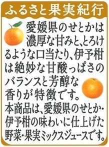 「野菜生活100 濃厚果実 愛媛せとか&伊予柑ミックス」は、濃厚な甘みと、とろけるような口当たりが特徴の愛媛県のせとかと、絶妙な甘酸っぱさのバランスと芳醇な香りが特徴の愛媛県の伊予柑の味わいに仕上げた、野菜&果実100%ミックスジュースです。おやつ・デザートタイムやリラックスシーンにおすすめです。