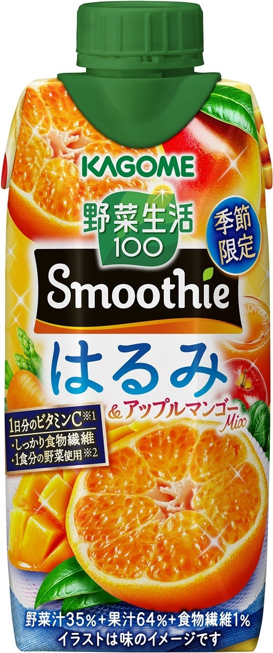 「野菜生活100 Smoothieはるみ&アップルマンゴーMix」は、はるみのジューシーな甘さとアップルマンゴーの豊かな香りをほのかに感じる季節限定の濃厚スムージーです。1食分の野菜(120g分)を使用※1し、しっかり食物繊維と1日分のビタミンC※2が摂れます。
