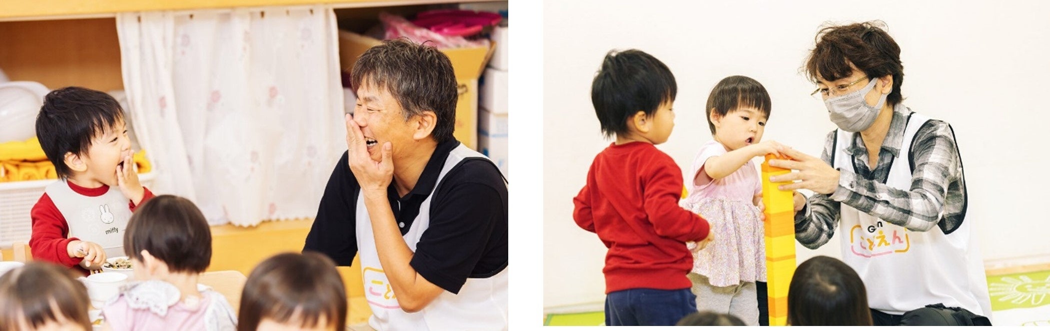 始まる前こそ緊張しているメンバーもいましたが、保育室で子どもたちの輪に入ると、子どもたちはすぐ打ち解け、参加者も笑顔で向かい合う様子がうかがえました。歌遊びや絵本の読み聞かせ、ごっこ遊び、屋内外で運動、給食など、いずれのクラスでも様々な活動を実施。子どもたちと、半日間触れ合いの時間が続きました。