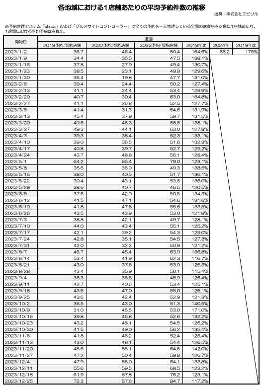全国の飲食店1店舗あたりにおける2023年12月度の1日平均予約数は9.5件と、コロナ禍以前の2019年同月比117%となり、予約件数ベースでは集計開始以降最多の数字となりました。また、2023年は全ての週で年間を通して2019年の予約件数を上回る結果となり、外食の需要においては大きな回復と成長がうかがえます。
