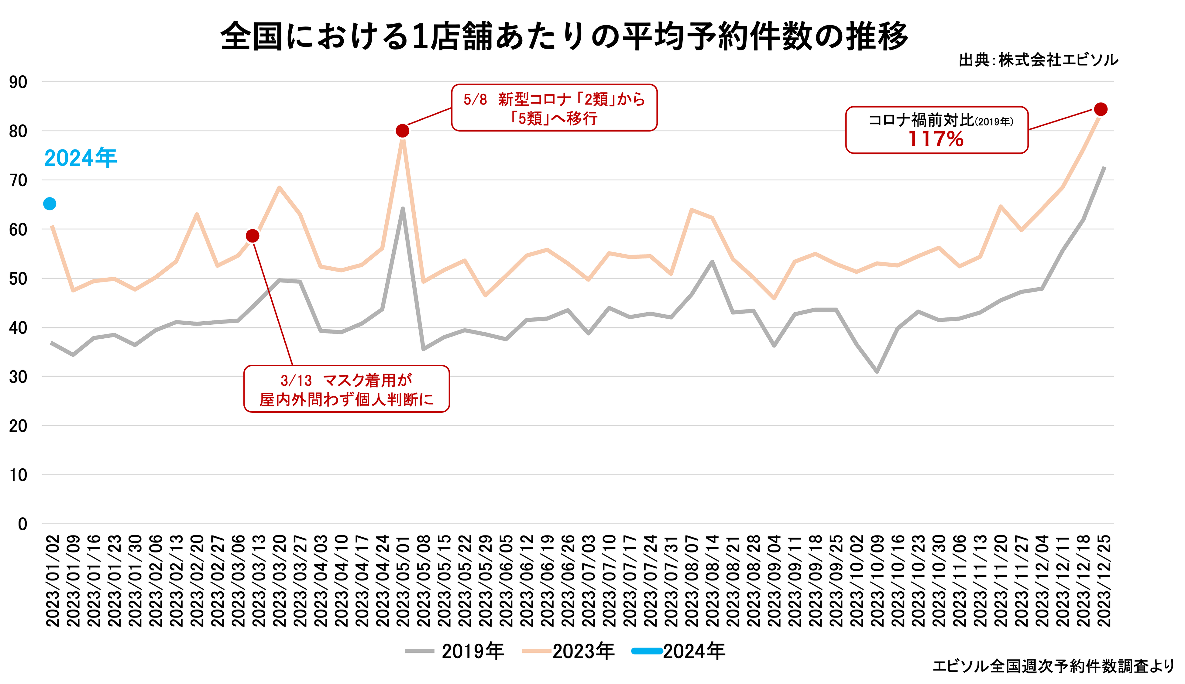 年間を通して見ると、新型コロナウイルスが「2類」から「5類」へ移行した5月8日の前週(5月1日週)にも大きな予約件数の増加が見られています。