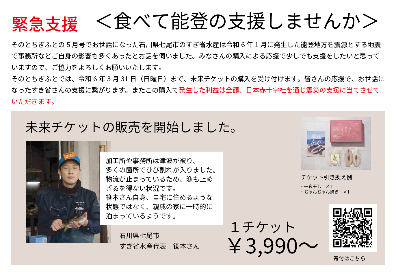 株式会社 picks design(本社:愛知県名古屋市、代表取締役:松浦克彦)が運営する、地域の食べ物と地域の観光ブックを届ける定期便サービス「そのとちぎふと」は、令和6年能登半島地震により被災された生産者に向けた支援として【震災支援】未来チケットを販売いたしました。未来チケットの購入による利益は、日本赤十字社を通じ被災地の支援に当てさせていただきます。
