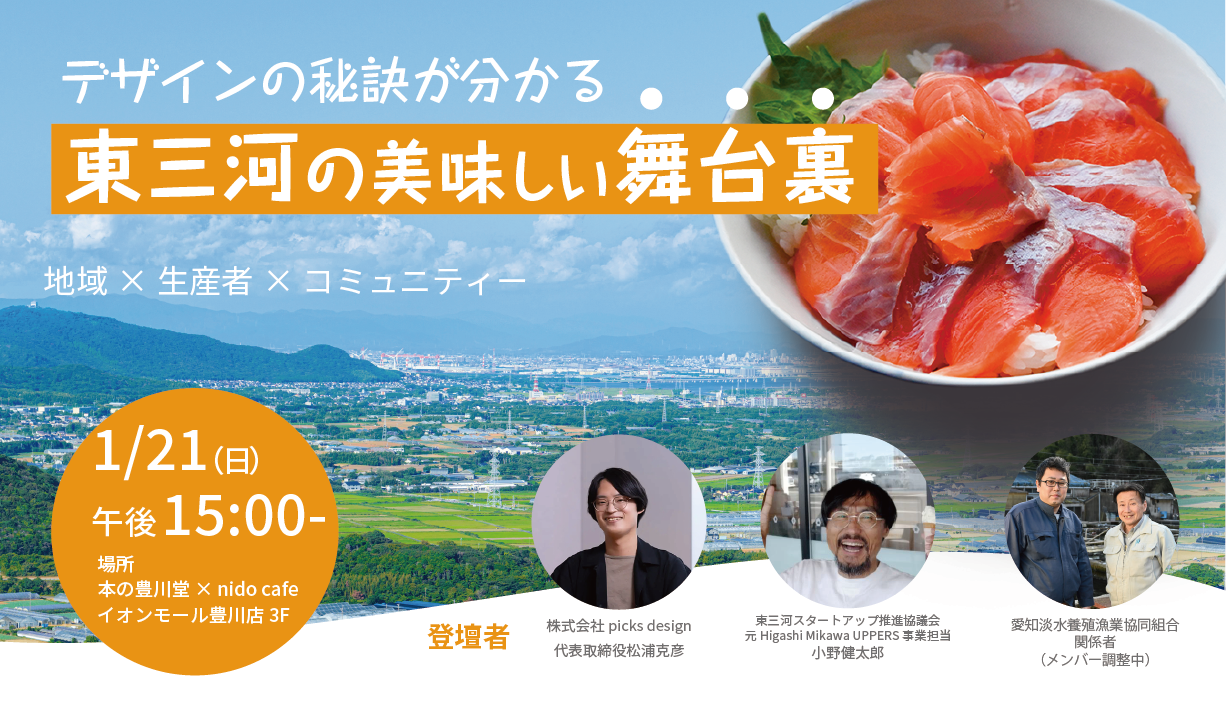 愛知淡水養殖漁業協同組合 金田 智希さん、東三河スタートアップ推進協議会 小野 健太郎さんをお招きし、株式会社picks design 代表取締役 松浦 克彦 の3名を中心にスタートアップと地域の新しいコラボレーションについてや、「そのとちぎふと」の事業についてのパネルディスカション等を開催予定です。