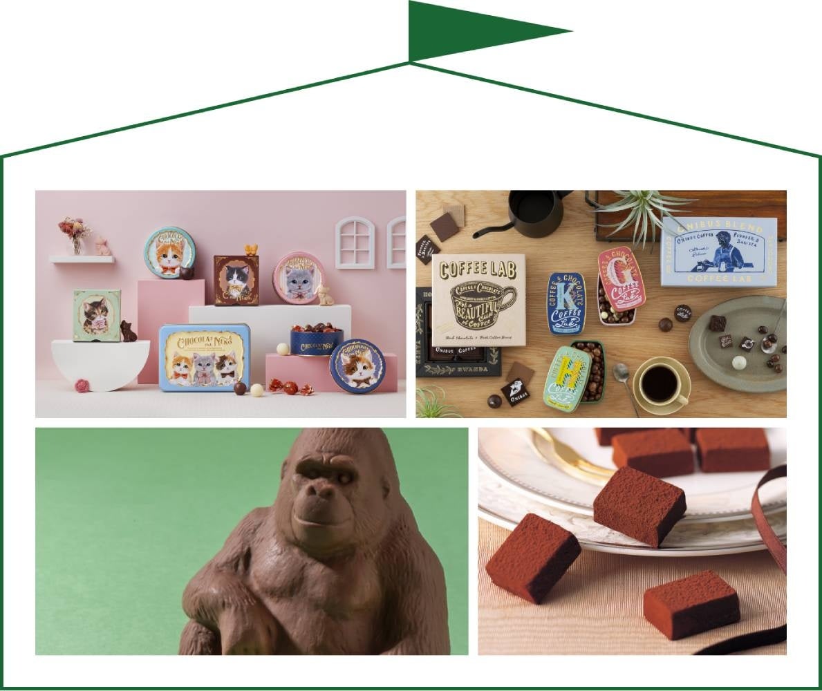 左上〈ショコラな猫 byモロゾフ〉、左下〈ZOOLOGY〉、右上〈コーヒーラボ(モロゾフ×オニバスコーヒー)〉、右下〈ロイズ〉