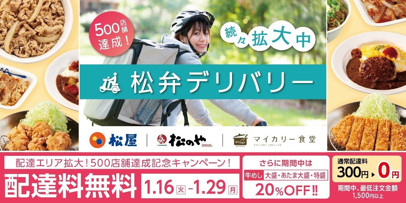 このたび松屋フーズ(本社:東京都武蔵野市、代表取締役社長:瓦葺一利)では、牛めし・カレー・定食・その他丼の「松屋」、とんかつ専門店の「松のや」、カレー専門店「マイカリー食堂」の対象店舗におきまして、2024年1月16日(火)から 2024年1月29日(月)まで、「松弁デリバリーエリア拡大500店舗達成キャンペーン」を開催いたします。