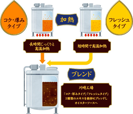 短時間で高温加熱した、風味を引き出す「フレッシュタイプ」と、長時間で高温加熱した、「コク・厚みタイプ」の厳選した2種類のオイスターエキスを絶妙にブレンドし、本格的な味わいに仕上げています。