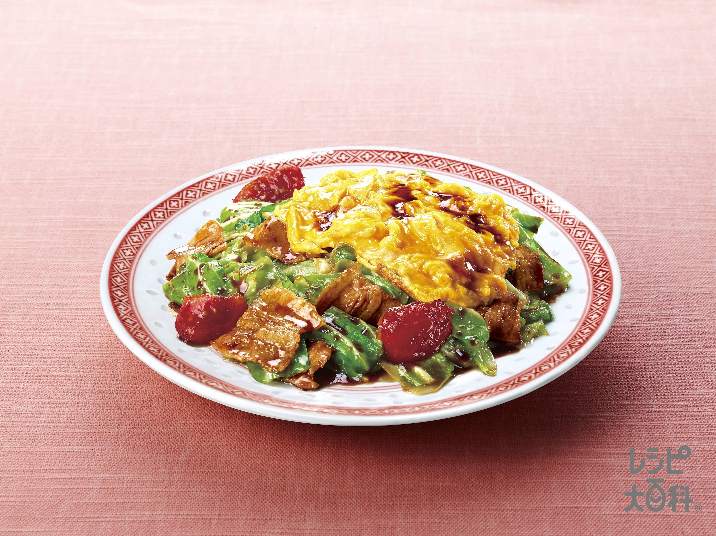 半熟状になるまで大きくかき混ぜながら広げる。③にのせ、最後に「オイスターソース」をかけて完成。