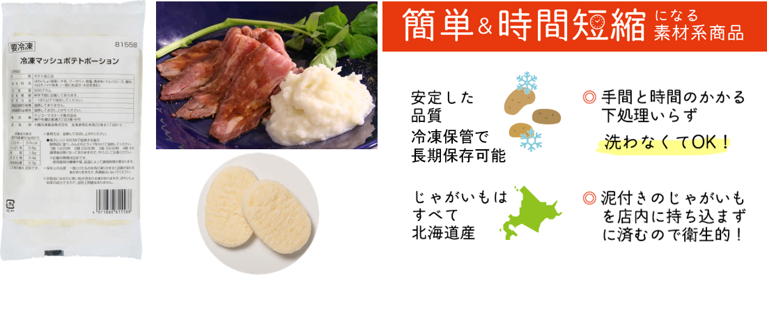 『冷凍マッシュポテトポーション』は、袋を開けるだけで使えて「時間短縮」になり、料理の素材として活用できる「素材系商品」です。社会問題となっている飲食店における人手不足の解消に役立つ商品として販売を開始しました。電子レンジで簡単に解凍することができ、誰でも手軽に安心して使えます。また、ポタージュやグラタンにもアレンジが可能で、メニューの幅が広がります。