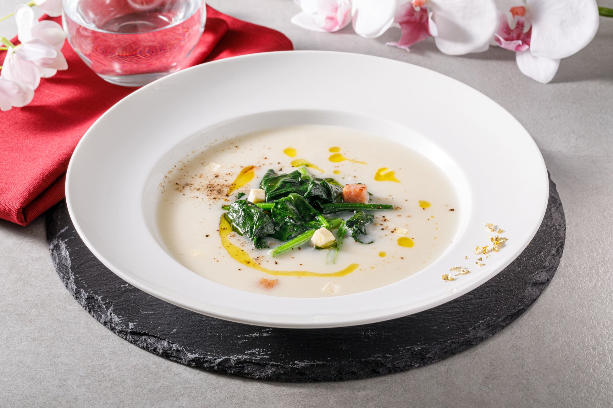 海のミネラルがたっぷり ! 太平洋にほど近い静岡県湖西市にある佐原さんの畑で育った大根を使用しました。素材の旨味が詰まったポタージュにほうれん草、ベーコンソテーを添えてお召し上がりください。