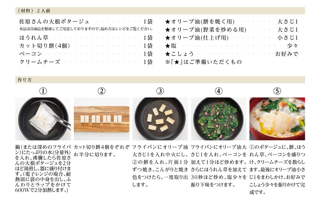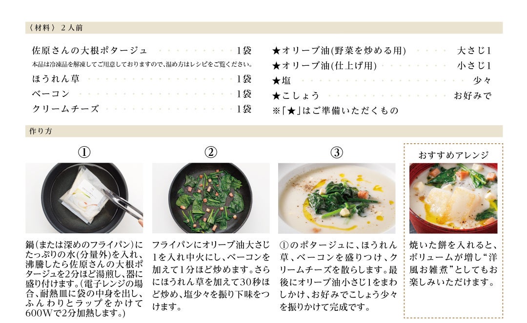 ①ほうれん草とベーコンの大根ポタージュ ②餅入り ほうれん草とベーコンの大根ポタージュ |