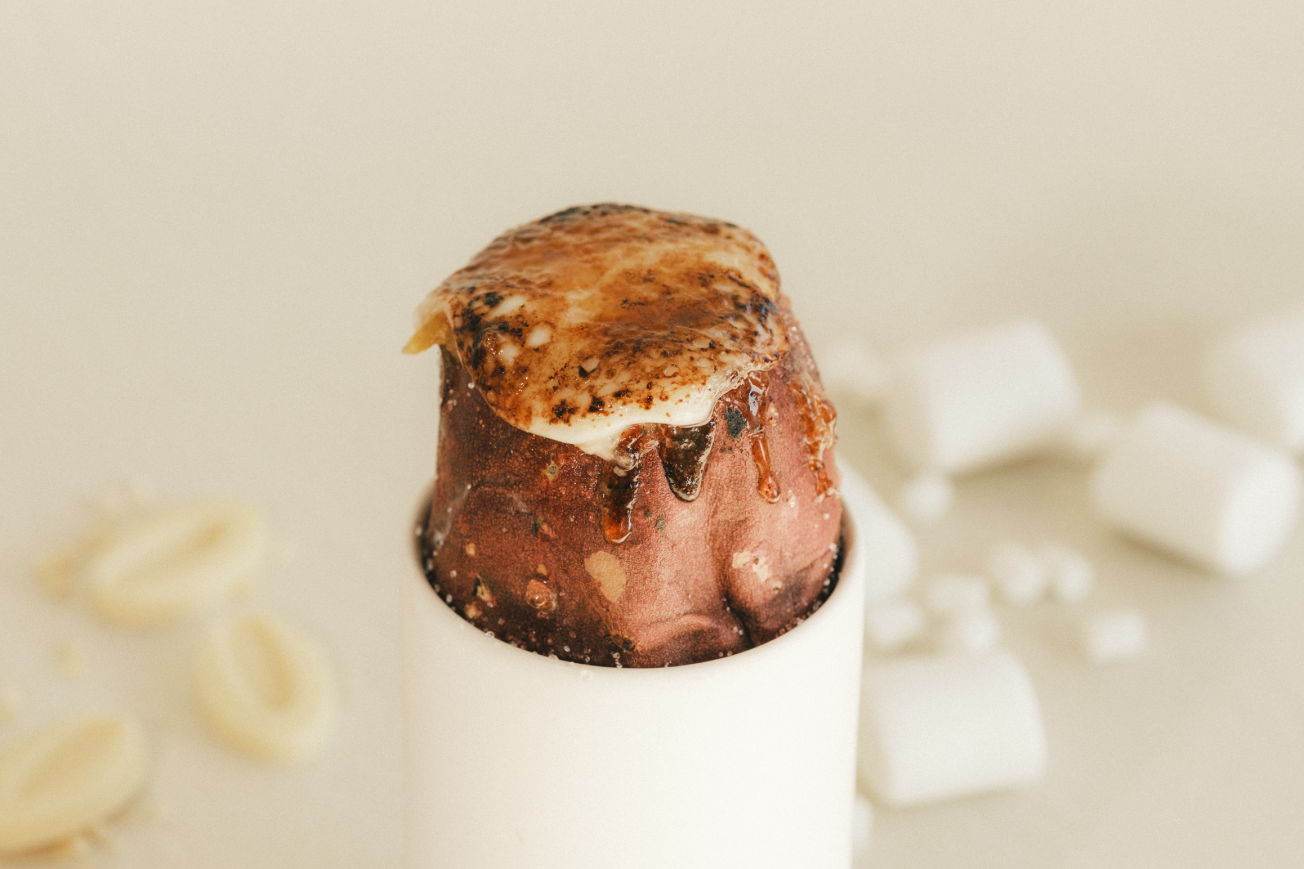 ホワイトデー期間限定の「壺芋ブリュレ 〜スイートホワイトチョコレートクリーム〜」はホワイトチョコクリームをベースにミニマシュマロとローストアーモンドのトッピングを混ぜこみました。ミニマシュマロのとろける食感とローストアーモンドの香ばしさが滑らかなクリームと相性抜群。