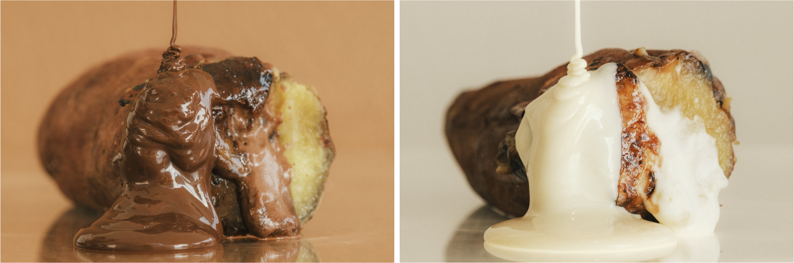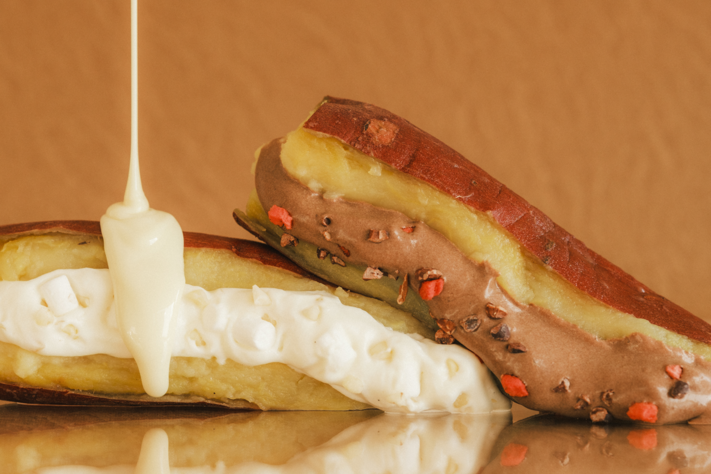 壺芋ブリュレは、従来の焼き芋のイメージを覆すほどに柔らかい壺焼き芋に、クリームをたっぷり詰めてブリュレしたお芋スイーツ。 付属のシュガーをかけてバーナーでジュワッと炙る体験と、できたてのブリュレとクリームの味わいを贅沢にご堪能いただけます。今冬は定番のカスタードクリームに加え、バレンタイン・ホワイトデー期間に合わせた2種類のフレーバーが登場。
