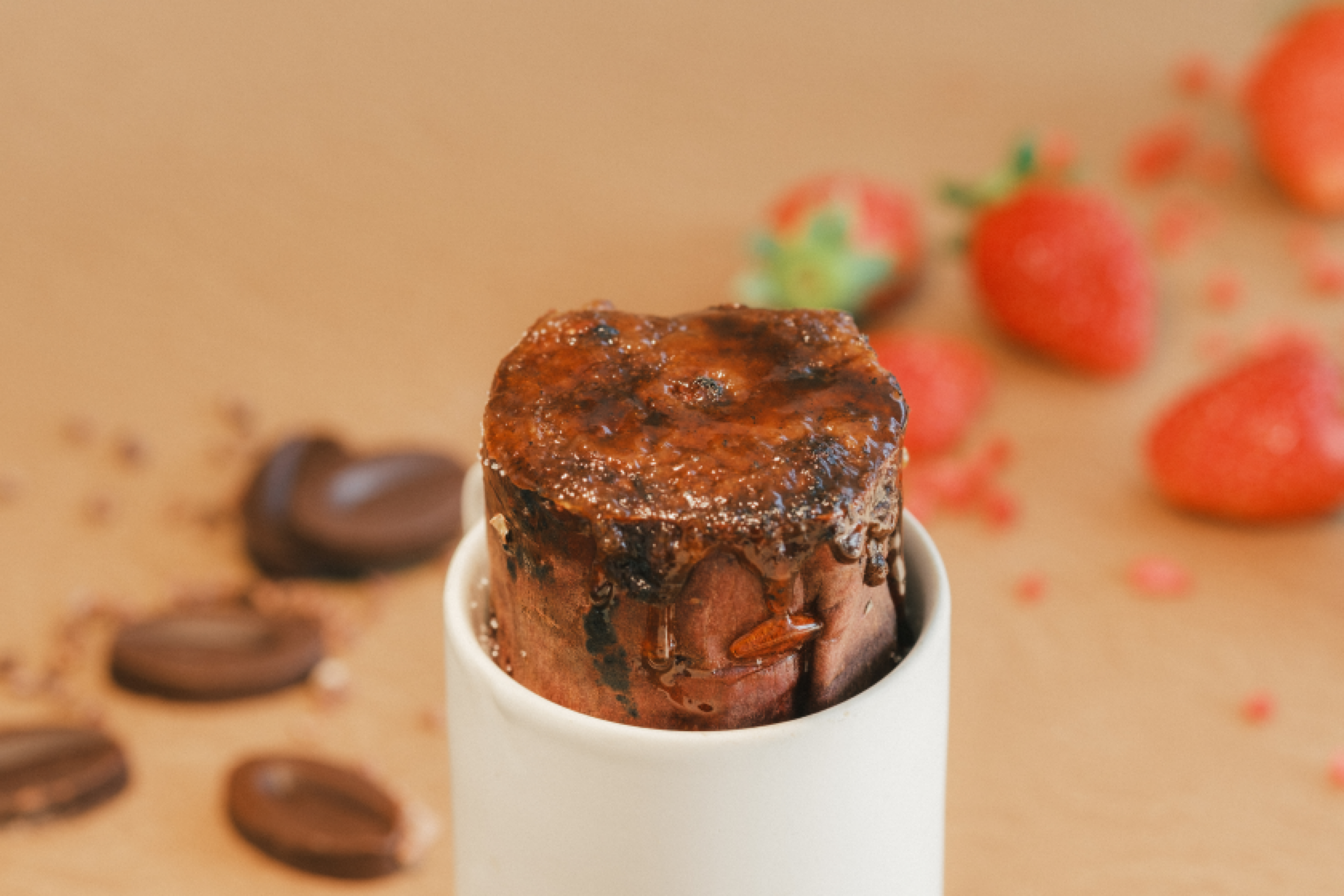 バレンタイン期間限定の「壺芋ブリュレ 〜ビターチョコレートクリーム〜」は甘さを抑えたビターチョコレートクリームに、カカオニブの華やかな香りと食感、ドライストロベリーの酸味が特徴的。大人の時間を彩る、至福のビターフレーバーをお楽しみください。