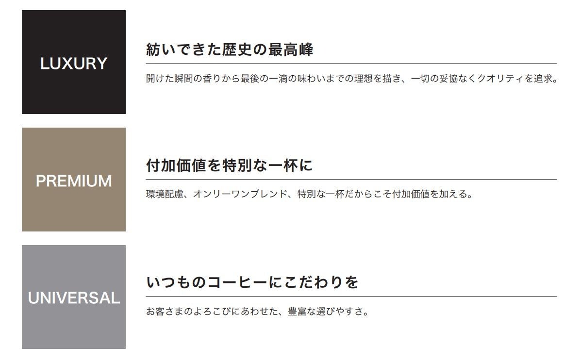 UCCコーヒープロフェッショナルの業務用レギュラーコーヒーブランドを “UCC Professional Brand Lines” として、『Largo』が属する「LUXURY」のほか、「PREMIUM」「UNIVERSAL」の3つのカテゴリに分類いたしました。