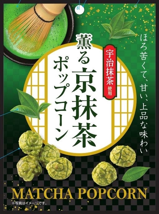 商品特徴:京都府産宇治抹茶を使用した、ほんのりとした抹茶の苦みと甘みをいかした蜜掛けコーティングのポップコーンです。