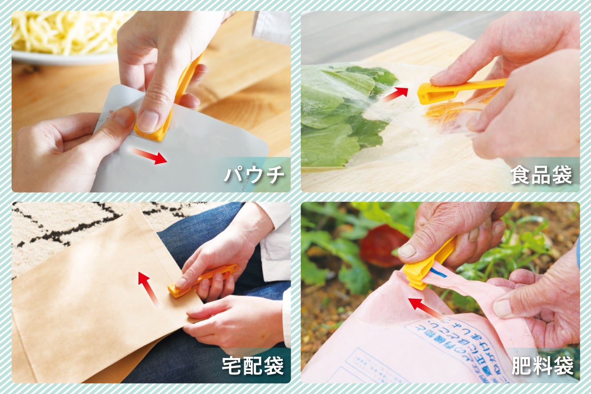 レトルトのパウチ、食品袋、宅配袋、肥料袋など、インドアからアウトドアまで、さまざまな開封作業をスムーズにできます。