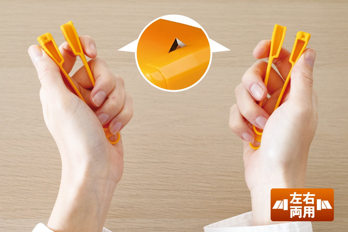 左右どちらの方向にも切れるV字形状刃、かつ、左右両用のグリップなので、利き手を問わず使用可能です