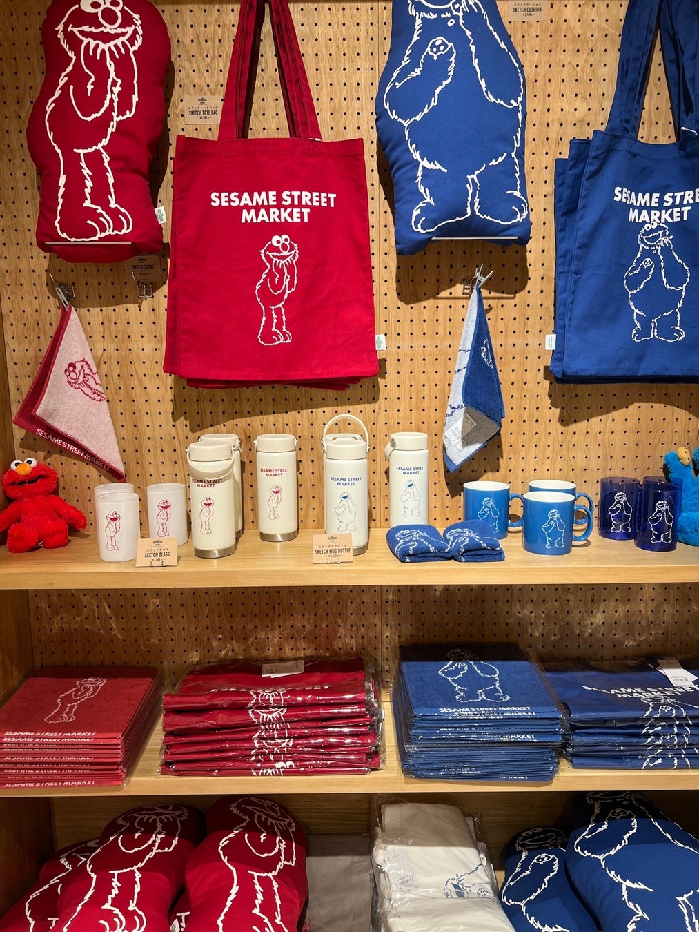 セサミストリートのヴィンテージ絵本からインスパイアされたオリジナルアートを一から描き起こした線画タッチのスケッチシリーズは、アイテムやキャラクターのバリエーションも豊富で、ぬいぐるみ同様オープン後から非常に好評を博しています。